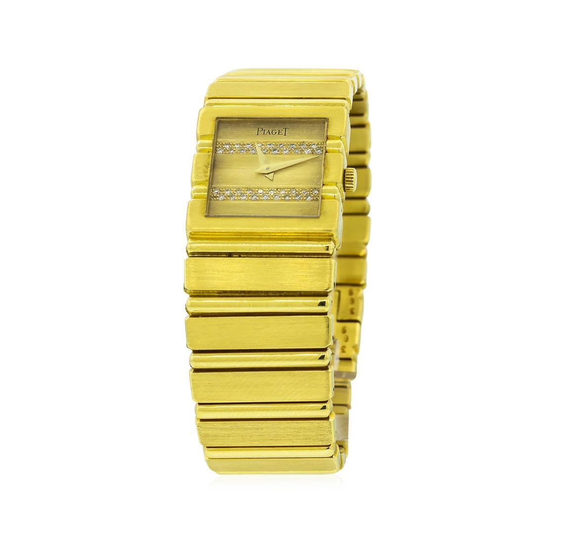 One, Piaget Polo 18KT yellow gold wristwatch electronically tested, Swiss Hallmarked Case: 20 x 20mm square, Case Back: secured by four set screws, engraved with the manufacturers name & ID numbers, Crown: scalloped, Bezel: pattern continuation, Crystal: synthetic sapphire. Movement: Swiss Quartz, Piaget Signed Dial: Champagne color, pattern continuation, including two rows of horizontally set diamonds, Piaget Bracelet: factory Polo links, Condition: G-6 Extra Fine. Six inch length. Piaget overlocking clasp, with logo. Containing: Thirty-Eight pave set single cut diamonds, measuring 1.00 - 1.00 x 0.60mm (depth est.) approximate total weight of 38 Stones = 0.14ct. Graded in the setting. Clarity: VS-1 Color F. Total Weight of Diamonds 0.14ct. Total Weight of Watch 99.40gm. AIG Appraised at $12,000.00.