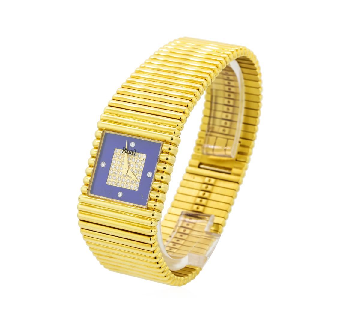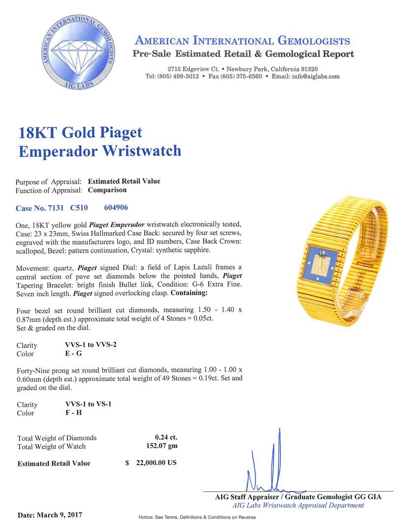 One, 18KT yellow gold Piaget Emperador wristwatch electronically tested, Case: 23 x 23mm, Swiss Hallmarked Case Back: secured by four set screws, engraved with the manufacturers logo, and ID numbers, Case Back Crown: scalloped, Bezel: pattern continuation, Crystal: synthetic sapphire. Movement: quartz, Piaget signed Dial: a field of Lapis Lazuli frames a central section of pave set diamonds below the pointed hands, Piaget Tapering Bracelet: bright finish Bullet link, Condition: G-6 Extra Fine. Seven inch length. Piaget signed overlocking clasp. Containing: Four bezel set round brilliant cut diamonds, measuring 1.50 - 1.40 x 0.87mm (depth est.) approximate total weight of 4 Stones = 0.05ct. Set & graded on the dial. Clarity: VVS-1 to VVS-2 Color E - G Forty-Nine prong set round brilliant cut diamonds, measuring 1.00 - 1.00 x 0.60mm (depth est.) approximate total weight of 49 Stones = 0.19ct. Set and graded on the dial. Clarity: VVS-1 to VS-1 Color F - H. Total Weight of Diamonds 0.24ct. Total Weight of Watch 152.07gm. AIG Appraised at $22,000.00.