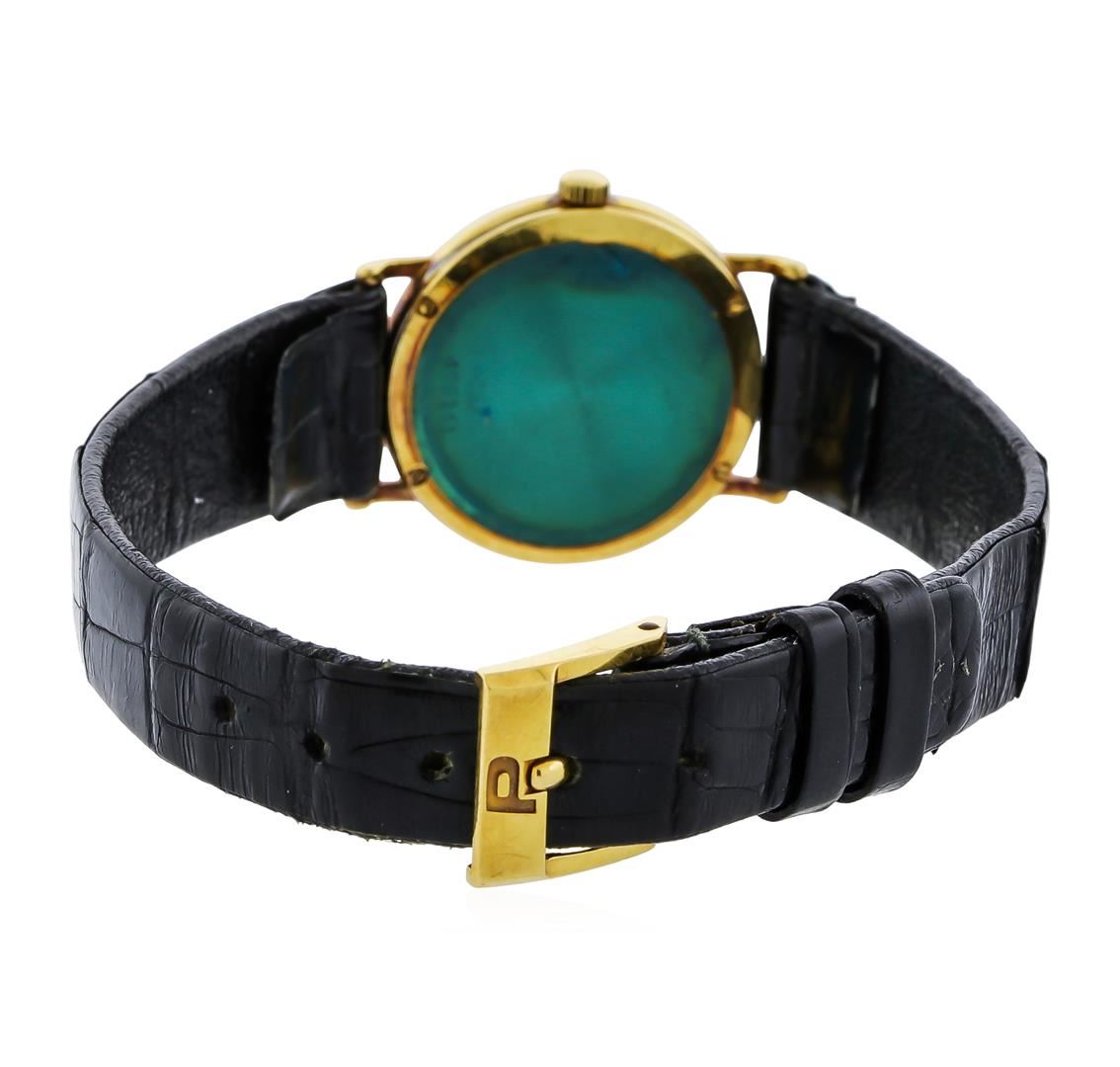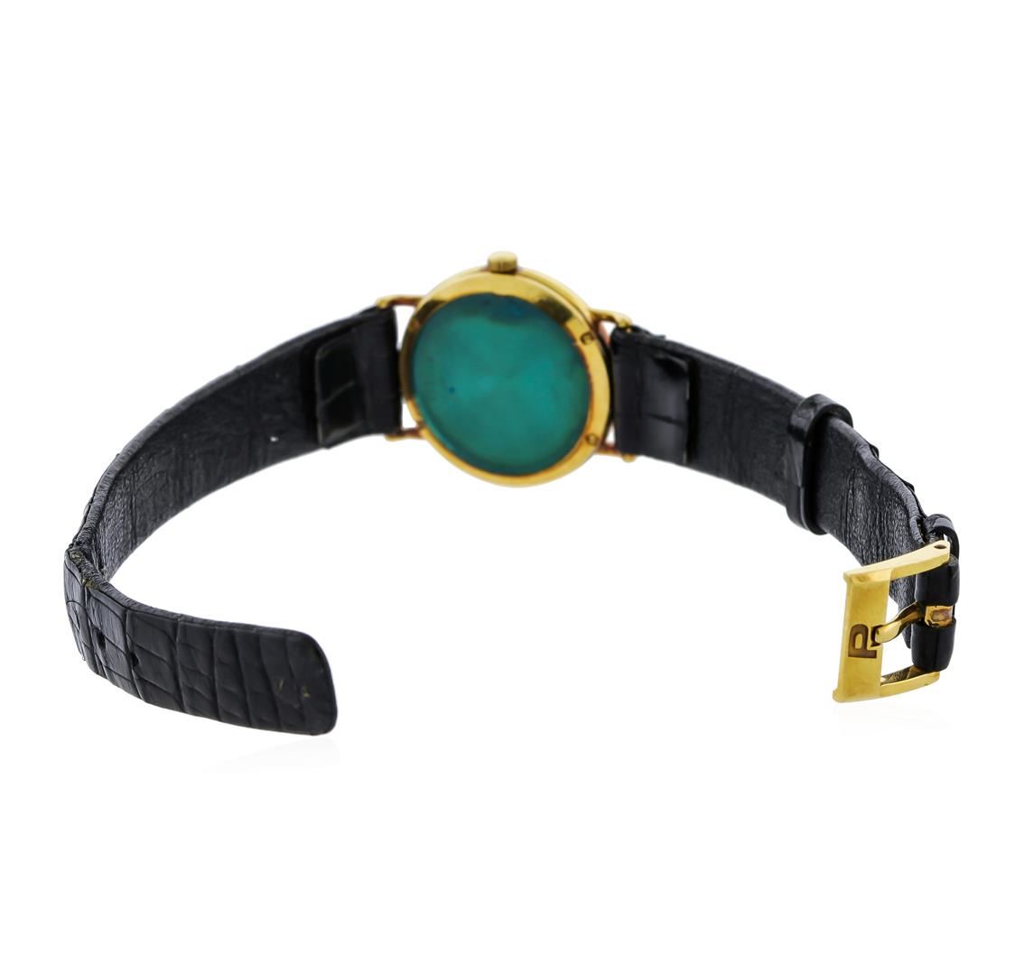 One ladies, Piaget wristwatch, electronically tested 18KT yellow gold, Swiss Hallmarked Case: 23mm diameter, Case Back: secured by four set screws, engraved with manufacturer's name & ID numbers, there is room available for a personalized engraving, Crown: scalloped, Bezel: polished, Crystal: synthetic sapphire lens. Movement: mechanical stem wind, Piaget signed Dial: Champagne color, pointed hands, eight indices, and four diamond markers, Bracelet: Black leather strap, seven and three quarter inch length. 18KT Yellow gold Piaget buckle. Condition: G-5 Fine. Total Weight of Wristwatch 21.65gm. AIG Appraised at $8,440.00.