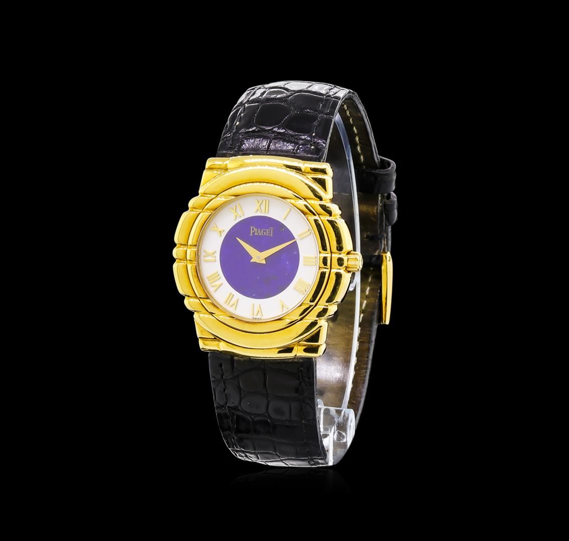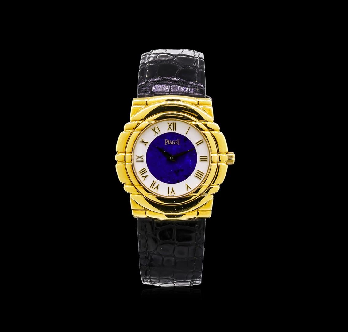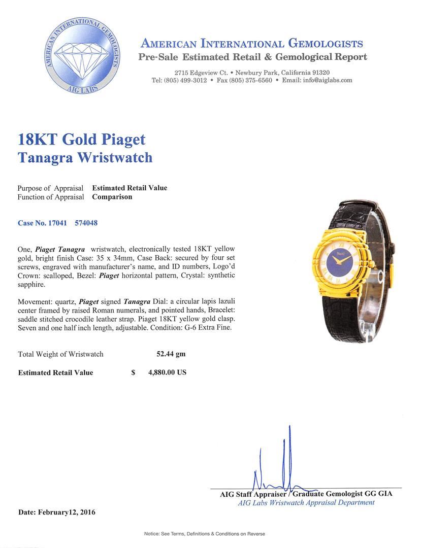One, Piaget Tanagra wristwatch, electronically tested 18KT yellow gold, bright finish Case: 35 x 34mm, Case Back: secured by four set screws, engraved with manufacturer's name, and ID numbers, Logo'd Crown: scalloped, Bezel: Piaget horizontal pattern, Crystal: synthetic sapphire. Movement: quartz, Piaget signed Tanagra Dial: a circular lapis lazuli center framed by raised Roman numerals, and pointed hands, Bracelet: saddle stitched crocodile leather strap. Piaget 18KT yellow gold clasp. Seven and one half inch length, adjustable. Condition: G-6 Extra Fine. Total Weight of Wristwatch 52.44gm. AIG Appraised at $4,880.00.