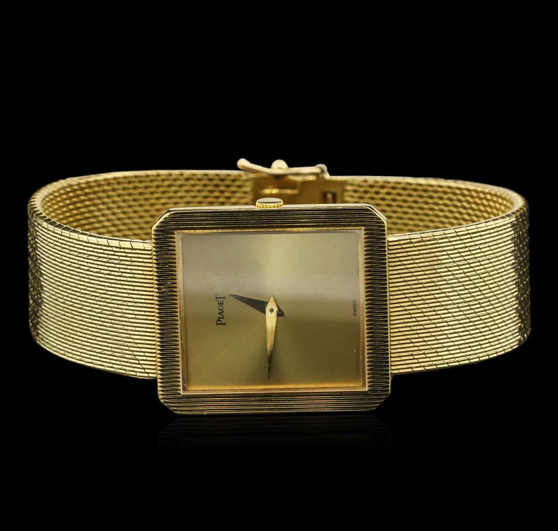 One Piaget 18KT Yellow Gold Watch. Case, bracelet, and clasp: 18KT yellow gold. Dial: Champagne color with gold tone hour and minute hands.
