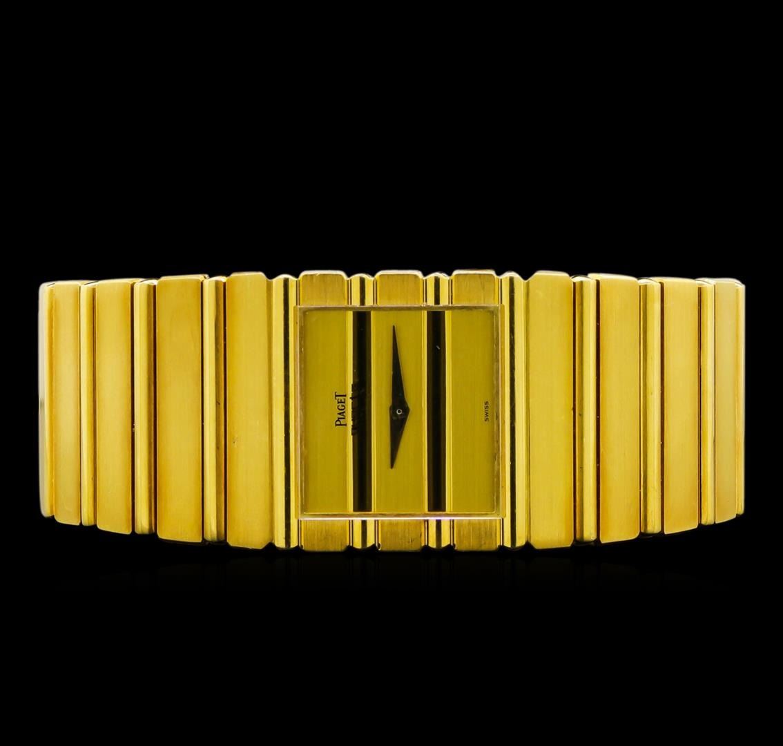 One Piaget watch featuring: Case: 18KT yellow gold. Dial: Gold color; gold tone hour and minute hands. Bracelet: 18KT yellow gold. Comes with extra links.
