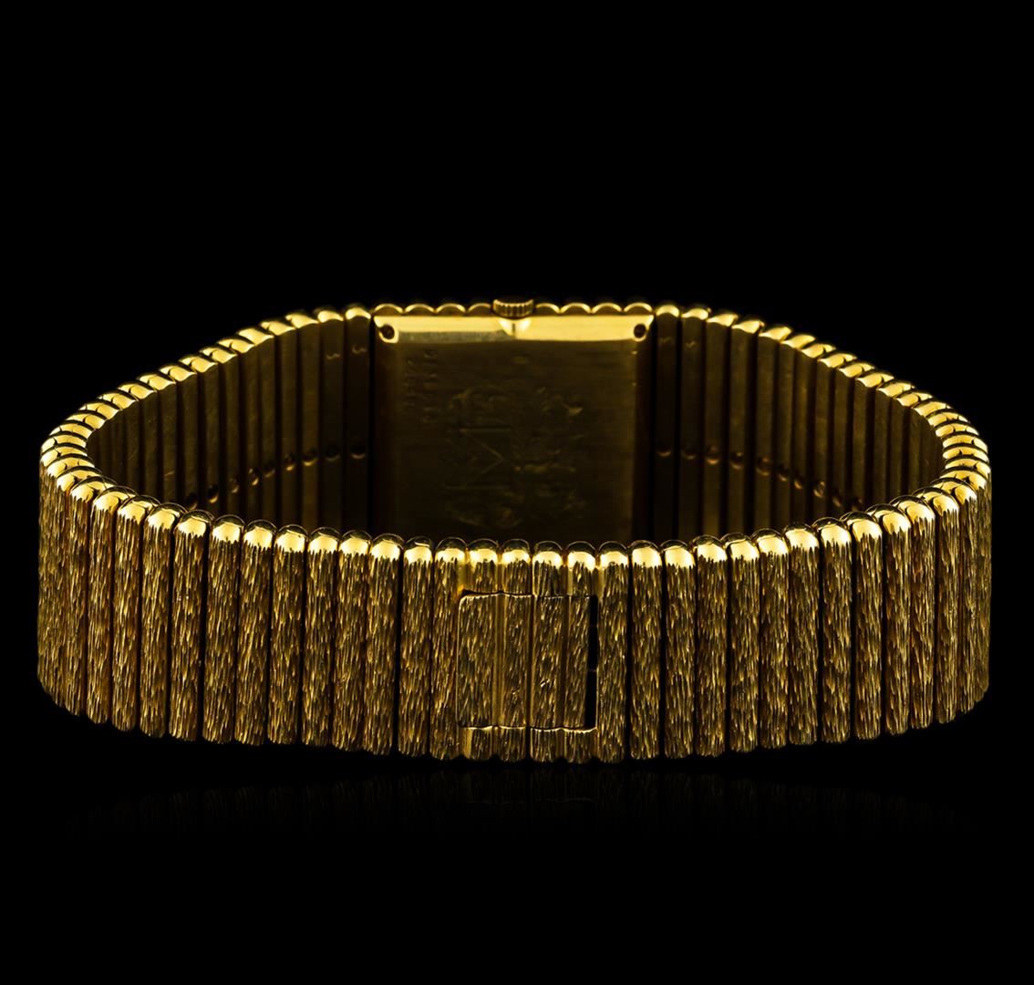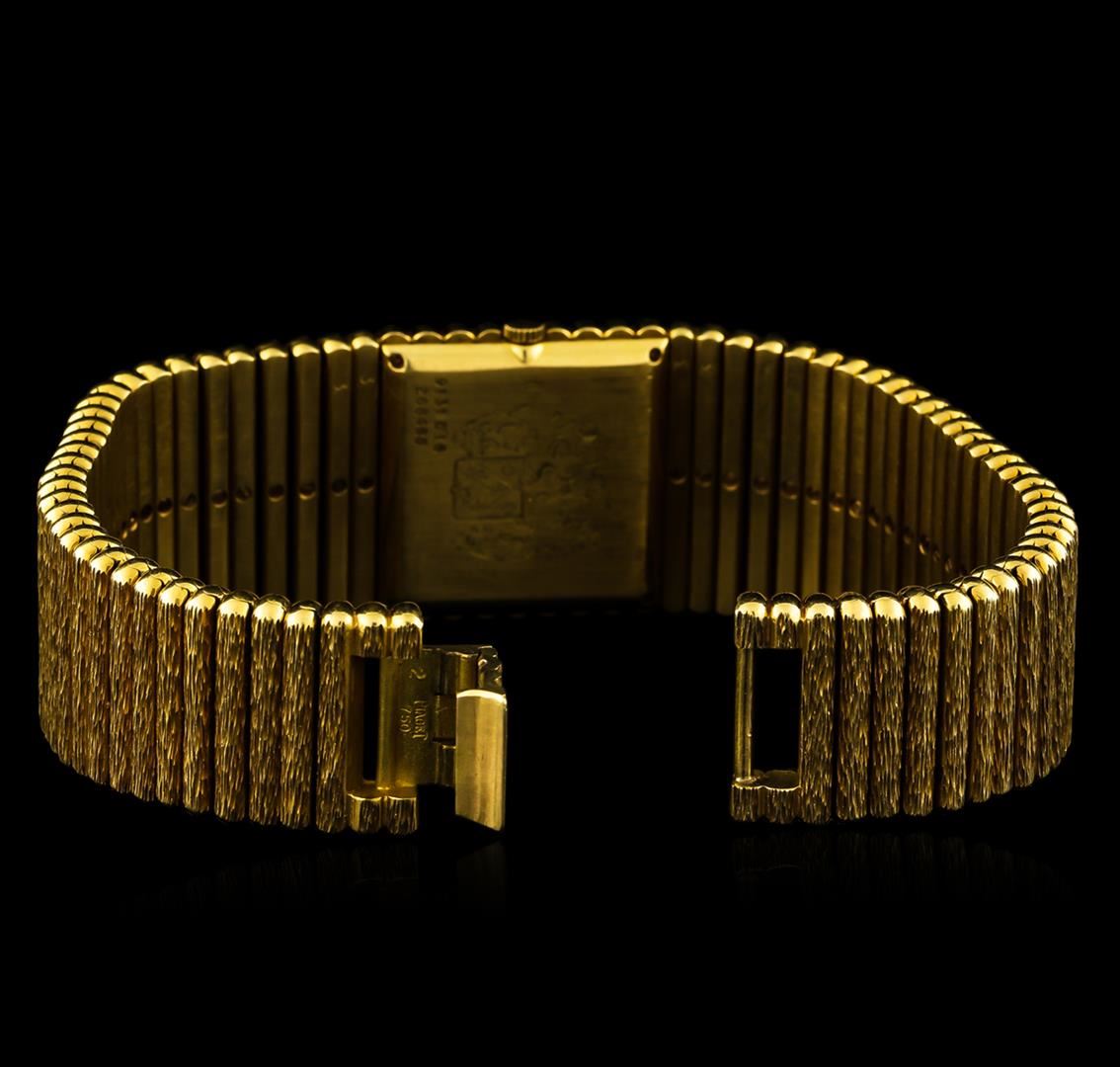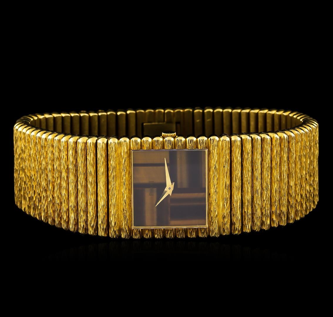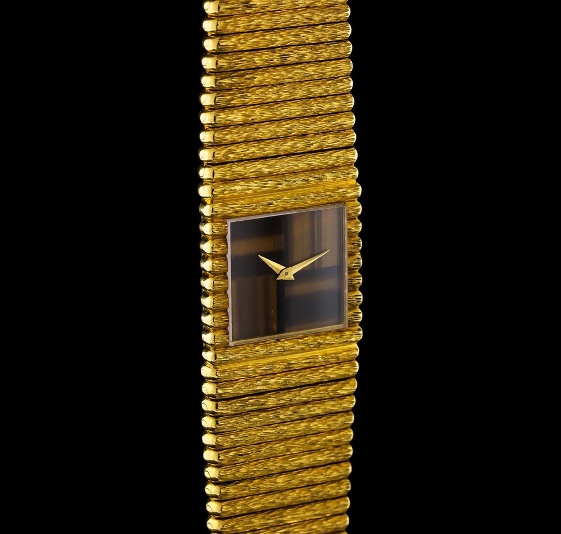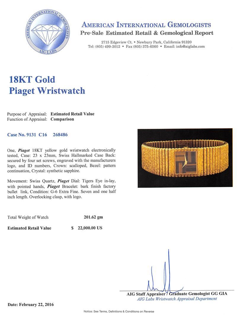 One, Piaget 18KT yellow gold wristwatch electronically tested, Case: 23 x 23mm, Swiss Hallmarked Case Back: secured by four set screws, engraved with the manufacturers logo, and ID numbers, Crown: scalloped, Bezel: pattern continuation, Crystal: synthetic sapphire. Movement: mechanical, Piaget Dial: Tigers Eye in-lay, with pointed hands, Piaget Tapering Bracelet: bark finish factory bullet link, Condition: G-6 Extra Fine. Seven and one half inch length. Overlocking clasp, with logo. Total Weight of Watch 201.62gm. AIG Appraised at $22,000.00.