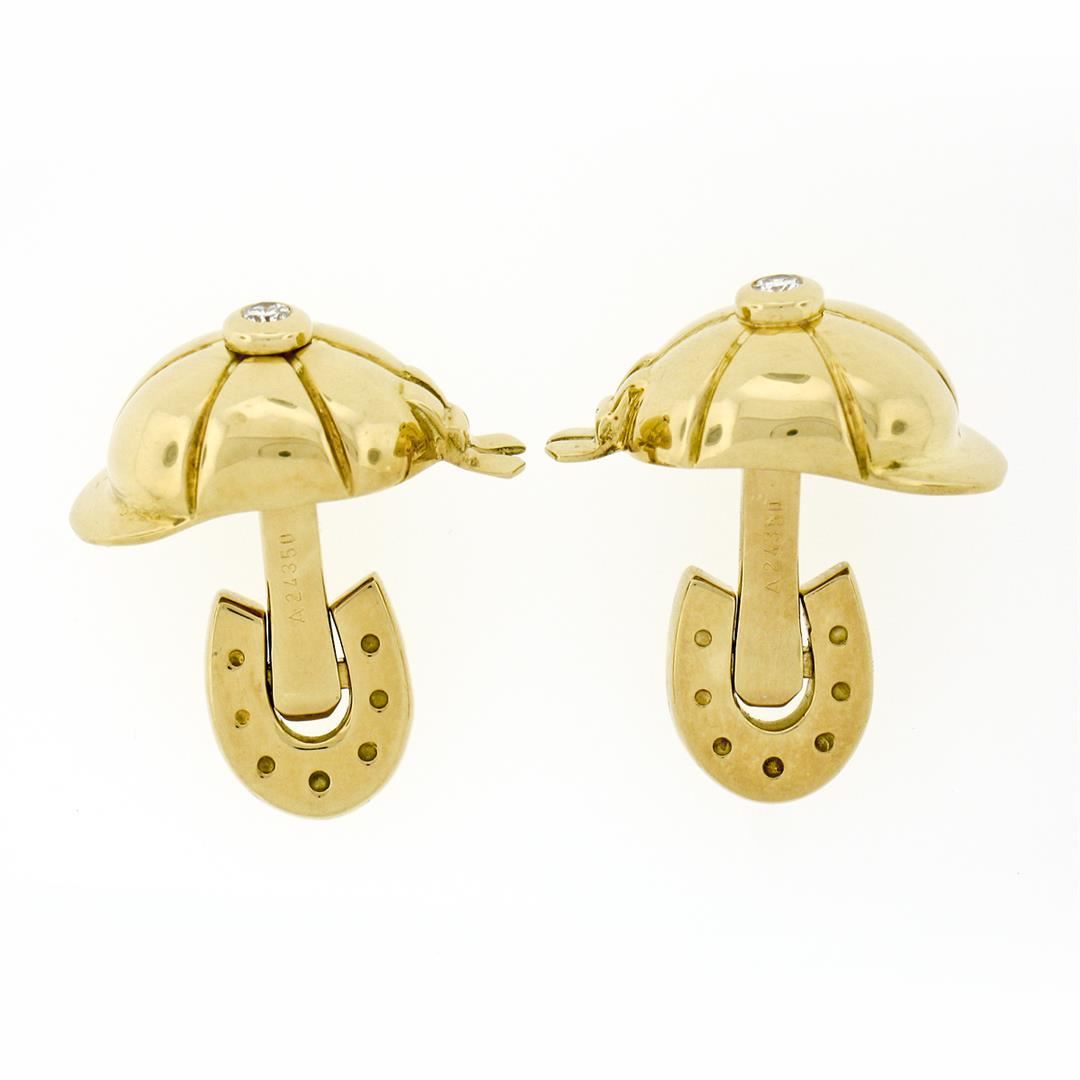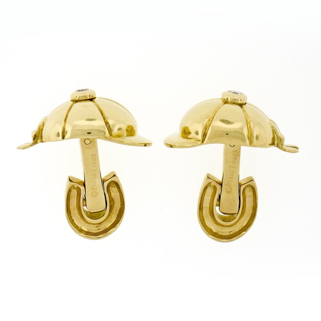 An estate solid 18k yellow gold cufflinks by Piaget, with 2 round brilliant cut natural diamonds (F - VVS2 ; 0.10ctw). These cuff links have a swivel design with a clearance of 9.30mm, weigh a total of 16.21 grams, and the front panels measure 13.82x22.68mm.