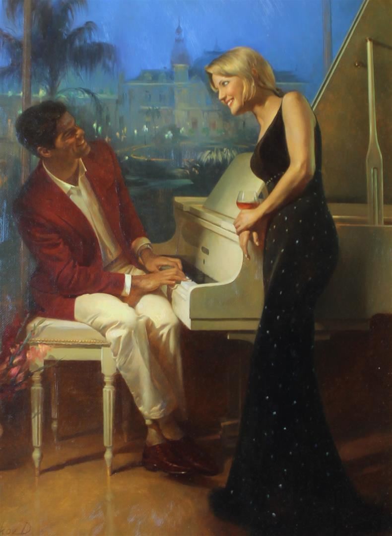 Russian artist, Dmitriy Volkov, depicts a pretty young woman holding a glass of wine and dressed in formal attire, standing next to a baby grand piano as she enjoys a conversation with the handsome pianist. The oil on canvas measures 24 x 18; framed image measures approx. 36 x 30.