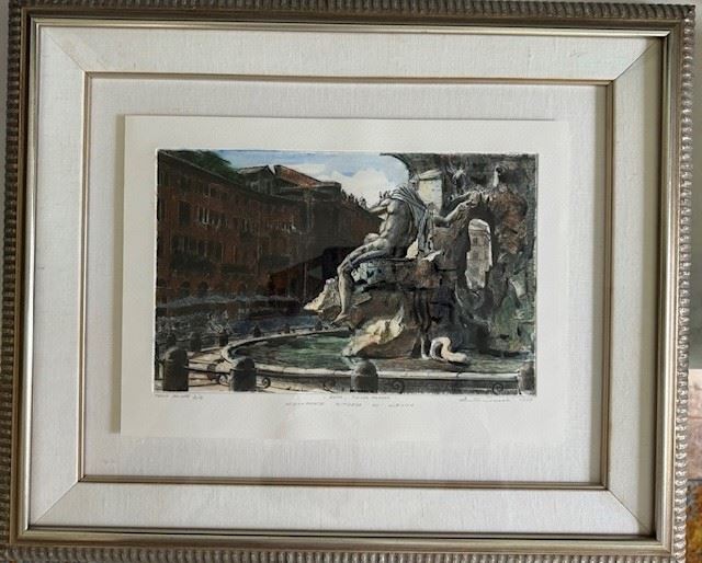A Unique hand-painted acrylic over limited edition etching by renown Milan artist Ernesto Ornati (1988), 8x4.5" on 20x14" paper, framed to 23x18.5".