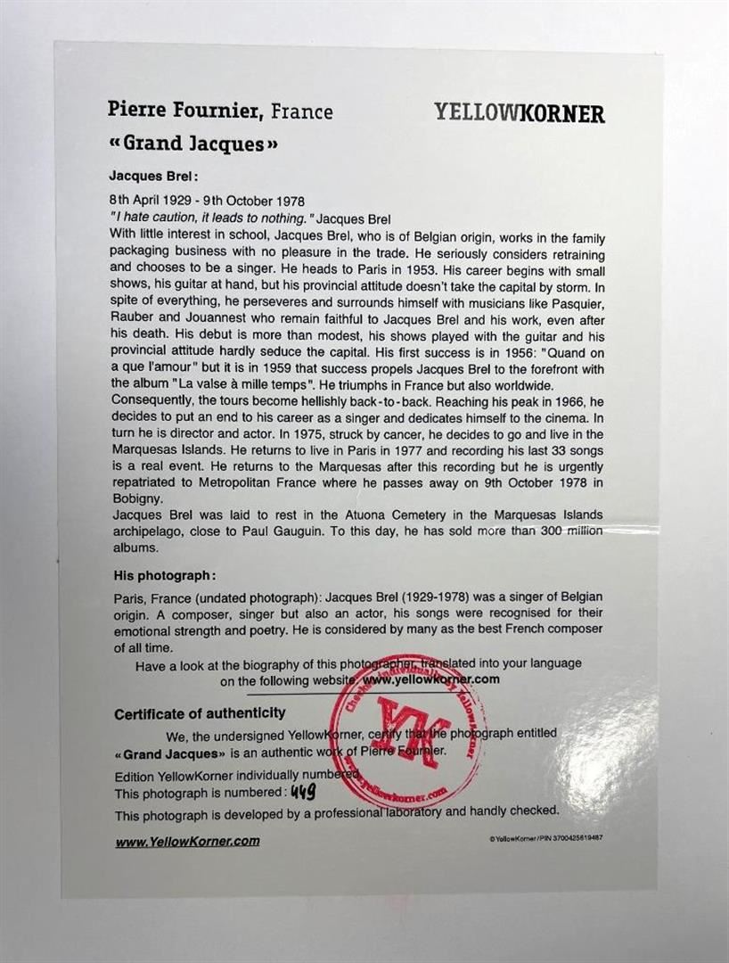 Pierre Fournier Jacques Brel France YellowKorner Certified Photograph. Certificate of Authenticity from YellowKorner affixed to the back. Matted Dimensions 16"x20". Protected with Clear Mylar Sleeve.
