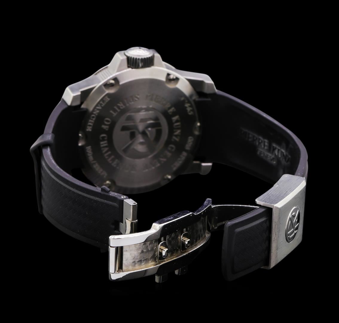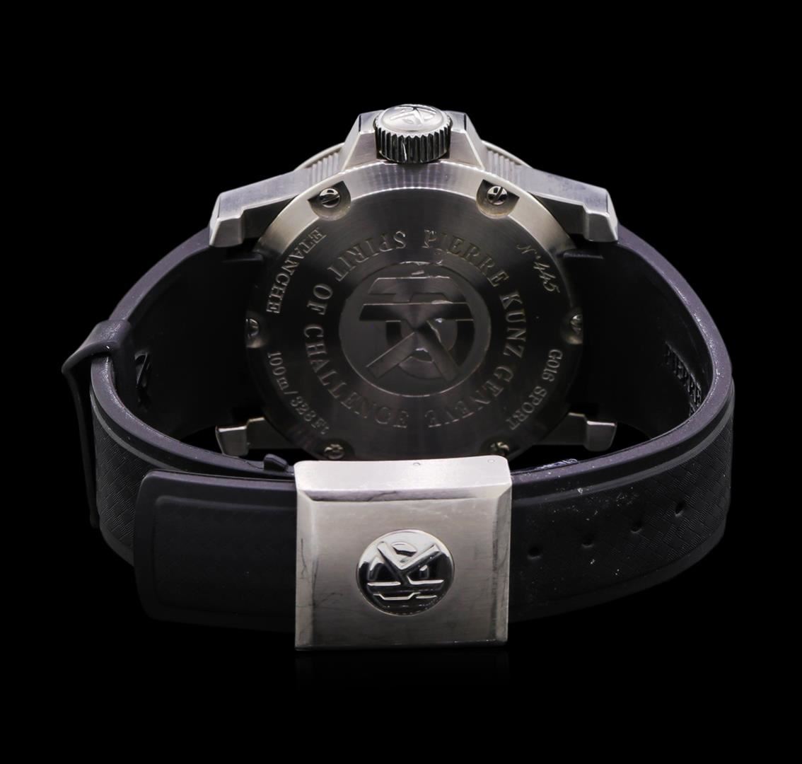 One Pierre Kunz PK G016 Sport men's watch featuring: Case: Stainless steel. Bezel: Stainless steel. Crystal: Sapphire. Dial: Black texalium. Functions: Hours, minutes, seconds, date, and 30 seconds retrograde second guilloche dial. Bracelet: Blue rubber with carbon fiber finish.