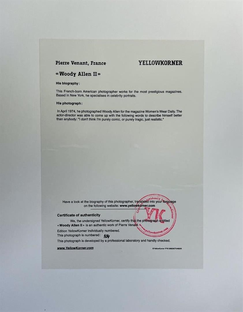 Pierre Venant France Woody Allen II YellowKorner Certified Photograph. Certificate of Authenticity from YellowKorner affixed to the back. Matted Dimensions 16"x20". Protected with Clear Mylar Sleeve.