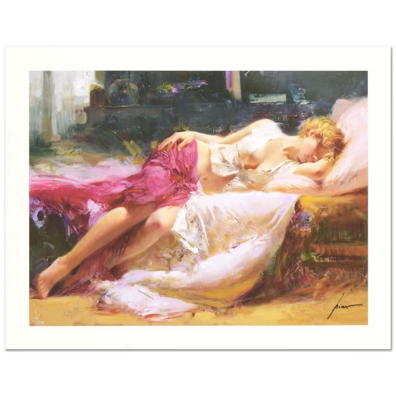 "Dreaming in Color" is a limited edition giclee on canvas by Pino (1931-2010), numbered and hand signed by the artist. Includes Certificate of Authenticity. Measures approx. 20" x 15" (image).