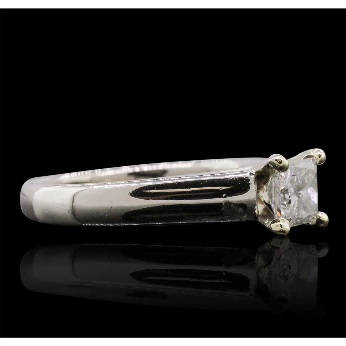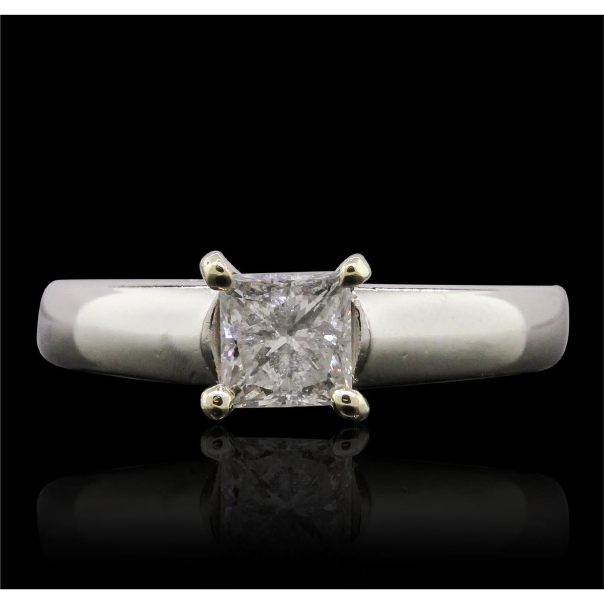 One electronically tested platinum ladies cast & assembled diamond solitaire ring. Condition is new, good workmanship. The featured diamond is set within a yellow gold basket supported by tapering shoulders, completed by a two and one-half millimeter wide band. Bright polish finish. Identified with markings of "PT 900". Containing: One prong set princess cut diamond, measuring 4.70 x 4.65 x 3.90mm (depth est.) approximate weight of 0.70ct with a faint blue fluorescence. Graded in the setting. Clarity: I-1. Color: 83.9%. Table 79.6%. Total Weight of Diamonds 0.70ct. Total Weight of Ring 7.17 grams. AIG Appraised at $5,770.00.