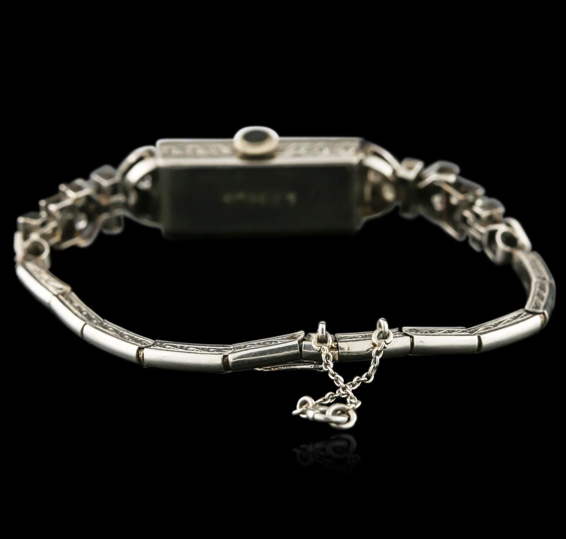 One ladies, vintage wristwatch electronically tested Platinum, Case: 22 x 10mm, Case Back: space available for engraving, Flexible Case Lug terminals: set with diamonds, Fixed Case Lugs: set with diamonds, Crown: scalloped edge, Bezel: diamond set, Crystal: acrylic. Movement: mechanical stem wind, Un-Signed Dial: pointed hands, and numerals, Platinum Bracelet, Condition: G- 4 Average. Six inch length, adjustable. Containing: Forty Eight, prong set single cut diamonds, approximate total weight of 48 Stones = 0.72ct. Graded in the setting. Clarity: VS-2 to SI-2 Average. Color: H - I. Total Weight of Diamonds 0.72ct. Total Weight of Watch 17.20 grams. AIG Appraised at $4,140.00.