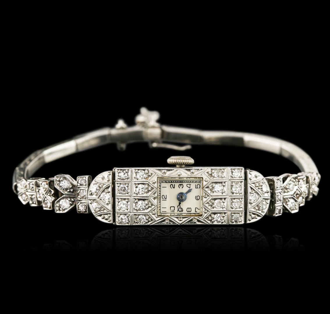 One ladies, vintage wristwatch electronically tested Platinum, Case: 22 x 10mm, Case Back: space available for engraving, Flexible Case Lug terminals: set with diamonds, Fixed Case Lugs: set with diamonds, Crown: scalloped edge, Bezel: diamond set, Crystal: acrylic. Movement: mechanical stem wind, Un-Signed Dial: pointed hands, and numerals, Platinum Bracelet, Condition: G- 4 Average. Six inch length, adjustable. Containing: Forty Eight, prong set single cut diamonds, approximate total weight of 48 Stones = 0.72ct. Graded in the setting. Clarity: VS-2 to SI-2 Average. Color: H - I. Total Weight of Diamonds 0.72ct. Total Weight of Watch 17.20 grams. AIG Appraised at $4,140.00.