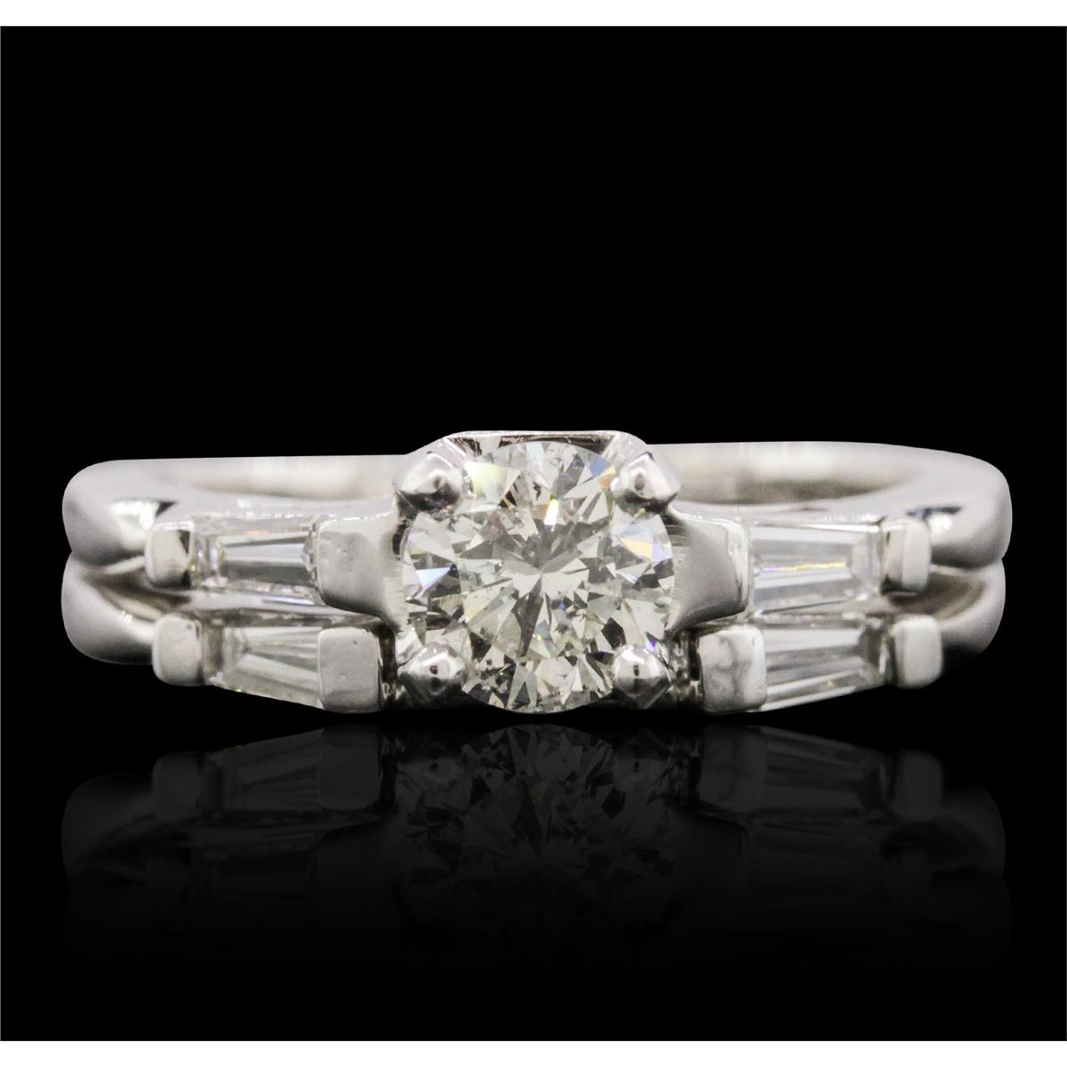 One electronically tested platinum Ladies combination cast & assembled engagement ring & wedding band with a bright polish finish. Condition is very good. Identified with markings of "PLAT". Containing: One prong set round brilliant cut diamond, measuring 5.45 - 5.45 x 3.40mm (depth est.) approximate weight of 0.62ct. Clarity: I-1. Color: K, Cut is Very Good. Four prong set baguette cut diamonds, measuring 3.20 x 1.50 x 1.28mm (depth est.) approximate. Total Weight of 4 Stones = 0.23ct. Clarity: VS-2. Color: H, Cut is Good. All diamonds are graded in the mounting, unless otherwise stated. Total Weight of Diamonds 0.84ct. Total Weight of Engagement Ring & Wedding Band 9.10 grams.. GGL Appraised at $10,185.00.