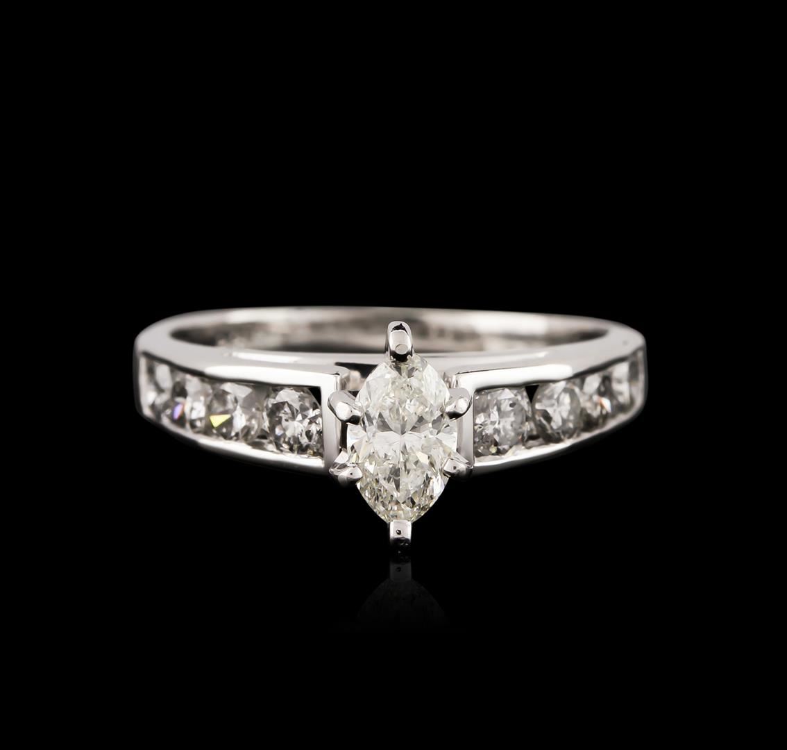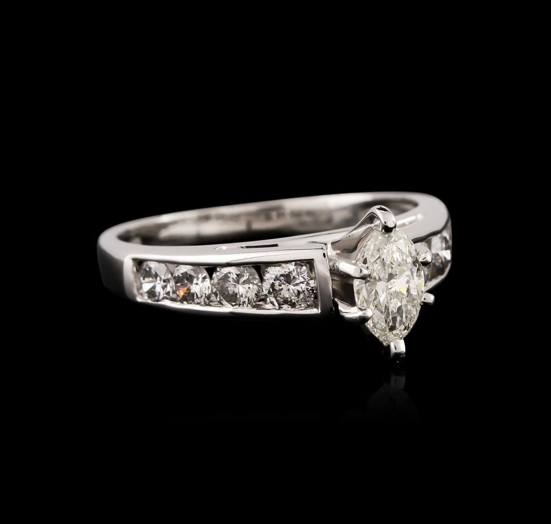 One electronically tested platinum ladies cast diamond engagement ring with a bright polish finish. Identified with markings of "PT 950". Condition is very good. Containing: One prong set marquise shaped cut diamond, measuring 6.50 x 4.00. x 2.52mm (depth est.) approximate weight of 0.38ct. Clarity: SI-2. Color: J, Cut is Good. Eight channel set round brilliant cut diamonds, measuring 3.00. - 2.50 x 1.65mm (depth est.) approximate total weight of 8 Stones = 0.61ct. Clarity: I-2 to I-3. Color: I - J, Cut is Good. All diamonds are graded in the mounting, unless otherwise stated. Total Weight of Diamonds 0.99ct. Total Weight of Engagement Ring 4.60 grams. GGL Appraised at $3,770.00.