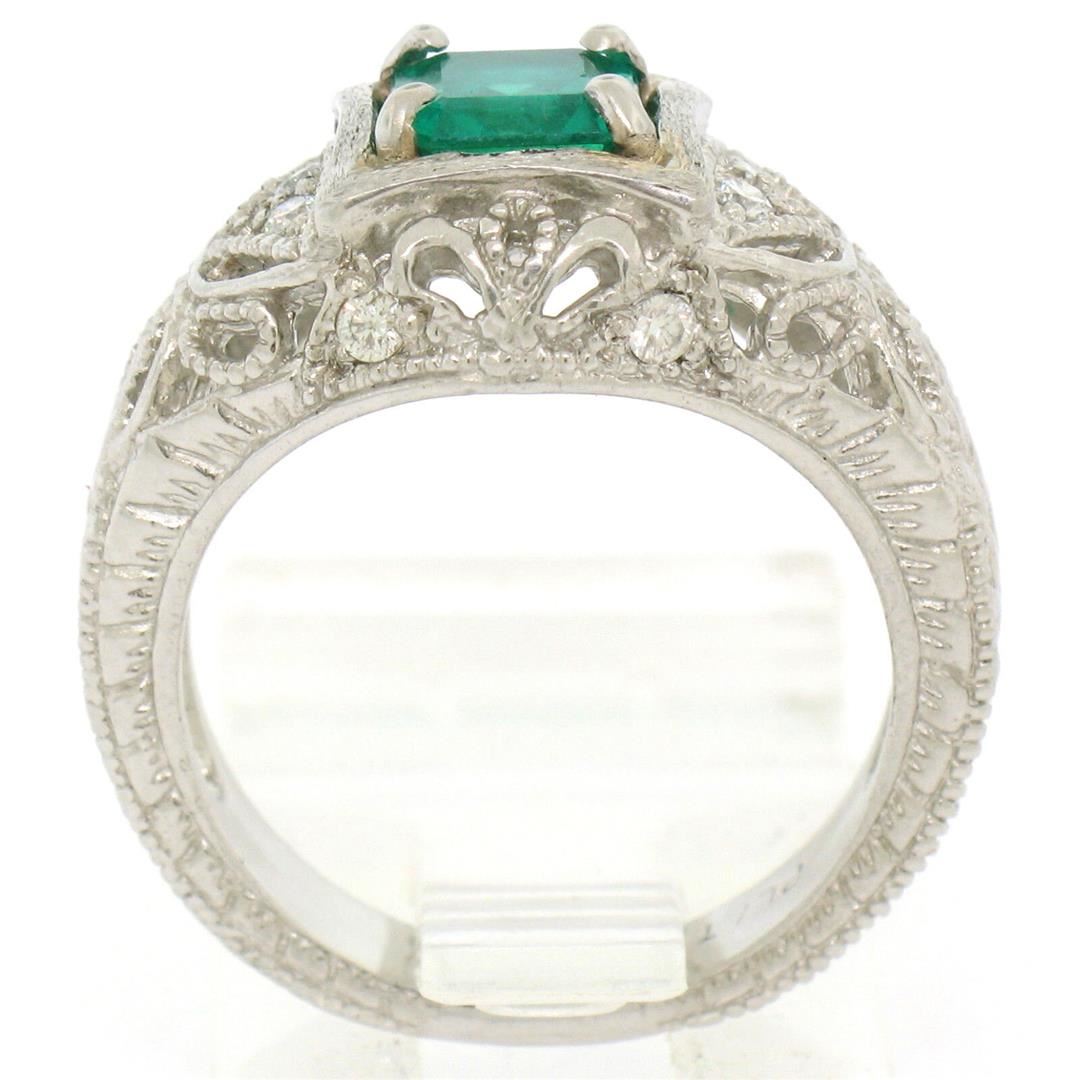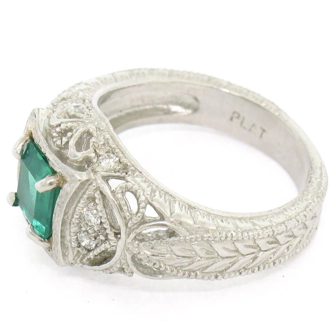 Platinum 1.04ct Radiant Emerald & Diamond Milgrain Filigree Etched Cocktail Ring. Please see photos and description for all available information. An estate solid platinum cocktail ring, faeturing 1 radiant cut natural emerald (0.92ct), and 8 round brilliant cut natural diamonds (F- VS1; 0.12ctw). The ring is size 5.5, weighs a total of 11.09 grams, and measures 11.85mm wide.