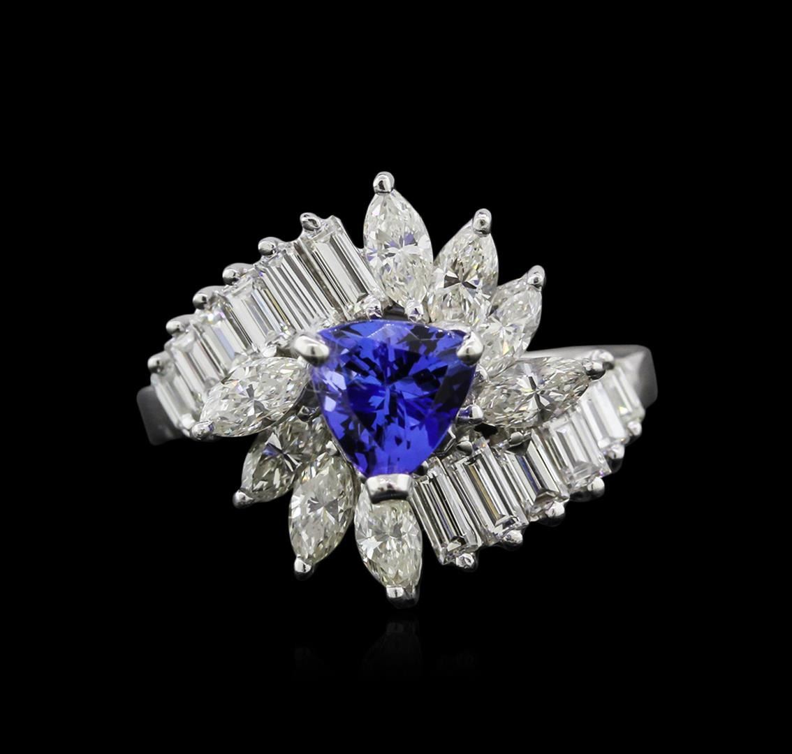 One electronically tested platinum ladies cast tanzanite and diamond ring with a bright polish finish. Identified with markings of "PLAT". Condition is new. Containing: One prong set triangle modified brilliant cut natural tanzanite, measuring 6.98 x 5.65 x 4.50mm, approximate weight of 1.07ct., clarity is eye clean, type I, medium light, very slightly grayish, violet color, (GIA V 4/3), cut is good. Eight prong set marquise shaped cut diamonds, measuring 4.50 x 2.50 x 1.58mm (depth est.) approximate total weight of 8 Stones = 0.83ct. Clarity: SI-1. Color: I - J, Cut is Good. Twelve channel set baguette cut diamonds, measuring from 1.70 x 1.50 x 1.28mm (depth est.) to 4.00 x 1.50 x 1.28mm (depth est.) approximate total weight of 12 Stones = 0.60 ct. Clarity: VS-2. Color: G - H, Cut is Good. All diamonds and colored gemstones are graded in the mounting, unless otherwise stated. Colored gemstones are presumed to have been subjected to commonly used enhancement processes. Total Weight of Colored Stones 1.07ct. Total Weight of Diamonds 1.43ct. Total Weight of Ring 9.60 grams. GGL Appraised.