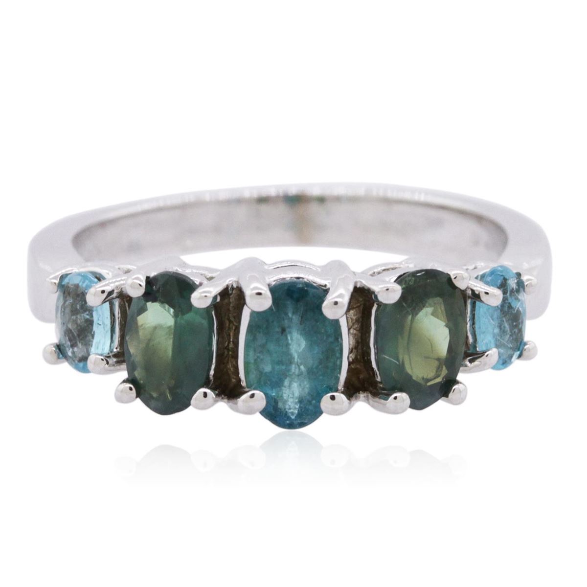 One electronically tested platinum ladies cast Paraiba tourmaline ring with a bright polish finish. The ring features a tiered Paraiba tourmaline curvature, completed by a two millimeter wide band. Identified with markings of "PLAT 950". Condition is new, good workmanship. Containing: Three prong set oval mixed cut natural Paraiba tourmalines, measuring 5.50 x 3.70 x 2.41mm, approximate total weight of 1.03ct., clarity is moderately included, cut is good. Transmitting light with a minimum of distortion, transparent. Naturally occurring internal & external characteristics are present. Graded in the setting. Two prong set oval mixed cut natural Paraiba tourmalines, measuring 4.00 x 2.50 x 1.63mm, approximate total weight of 0.30ct., clarity is moderately included, cut is good. Transmitting light with a minimum of distortion, transparent. Naturally occurring internal & external characteristics are present. Graded in the setting. This particular color combination is usually indicative of tourmaline from the state of Paraiba, village of Sao Jose da Batalha in northeastern Brazil. However, the origin for this tourmaline is determined to be the African Continent. African Paraiba color Tourmaline was first discovered in 2001 at the Edoukou Mine in Oyo Nigeria, close to the border of Benin and more recently in Zambezia, Mozambique. African Paraiba is believed to exist due to the continental drift theory. 200+ million years ago the earth's continents were joined together in one enormous super-continent called Pangaea. Compare the profile of western Africa and eastern South America; they fit together like pieces in a puzzle. This comparison suggests that they once belonged to a single landmass with similar geological conditions. The African tourmalines were created under the same conditions as the tourmalines from Paraiba, before the continents drifted apart. The African Paraiba color tourmaline is mined in alluvial deposits, the Brazilian Paraiba is mined underground. Total Weight of Colored Stones 1.33ct. Total Weight of Ring 3.91 grams. AIG Appraised at $4,780.00.