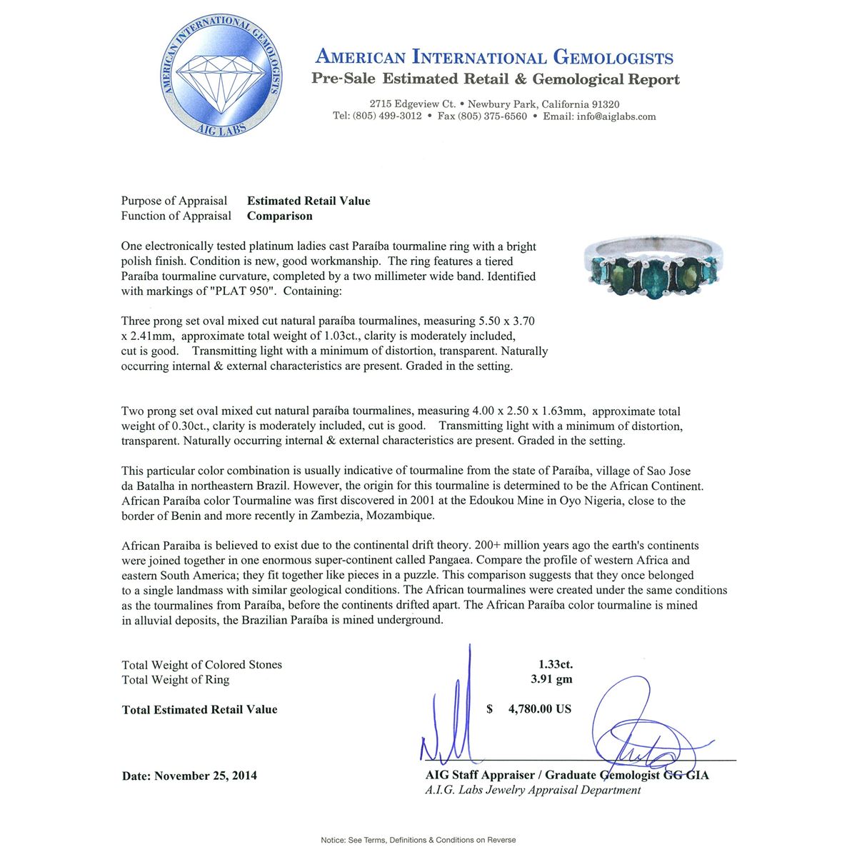 One electronically tested platinum ladies cast Paraiba tourmaline ring with a bright polish finish. The ring features a tiered Paraiba tourmaline curvature, completed by a two millimeter wide band. Identified with markings of "PLAT 950". Condition is new, good workmanship. Containing: Three prong set oval mixed cut natural Paraiba tourmalines, measuring 5.50 x 3.70 x 2.41mm, approximate total weight of 1.03ct., clarity is moderately included, cut is good. Transmitting light with a minimum of distortion, transparent. Naturally occurring internal & external characteristics are present. Graded in the setting. Two prong set oval mixed cut natural Paraiba tourmalines, measuring 4.00 x 2.50 x 1.63mm, approximate total weight of 0.30ct., clarity is moderately included, cut is good. Transmitting light with a minimum of distortion, transparent. Naturally occurring internal & external characteristics are present. Graded in the setting. This particular color combination is usually indicative of tourmaline from the state of Paraiba, village of Sao Jose da Batalha in northeastern Brazil. However, the origin for this tourmaline is determined to be the African Continent. African Paraiba color Tourmaline was first discovered in 2001 at the Edoukou Mine in Oyo Nigeria, close to the border of Benin and more recently in Zambezia, Mozambique. African Paraiba is believed to exist due to the continental drift theory. 200+ million years ago the earth's continents were joined together in one enormous super-continent called Pangaea. Compare the profile of western Africa and eastern South America; they fit together like pieces in a puzzle. This comparison suggests that they once belonged to a single landmass with similar geological conditions. The African tourmalines were created under the same conditions as the tourmalines from Paraiba, before the continents drifted apart. The African Paraiba color tourmaline is mined in alluvial deposits, the Brazilian Paraiba is mined underground. Total Weight of Colored Stones 1.33ct. Total Weight of Ring 3.91 grams. AIG Appraised at $4,780.00.