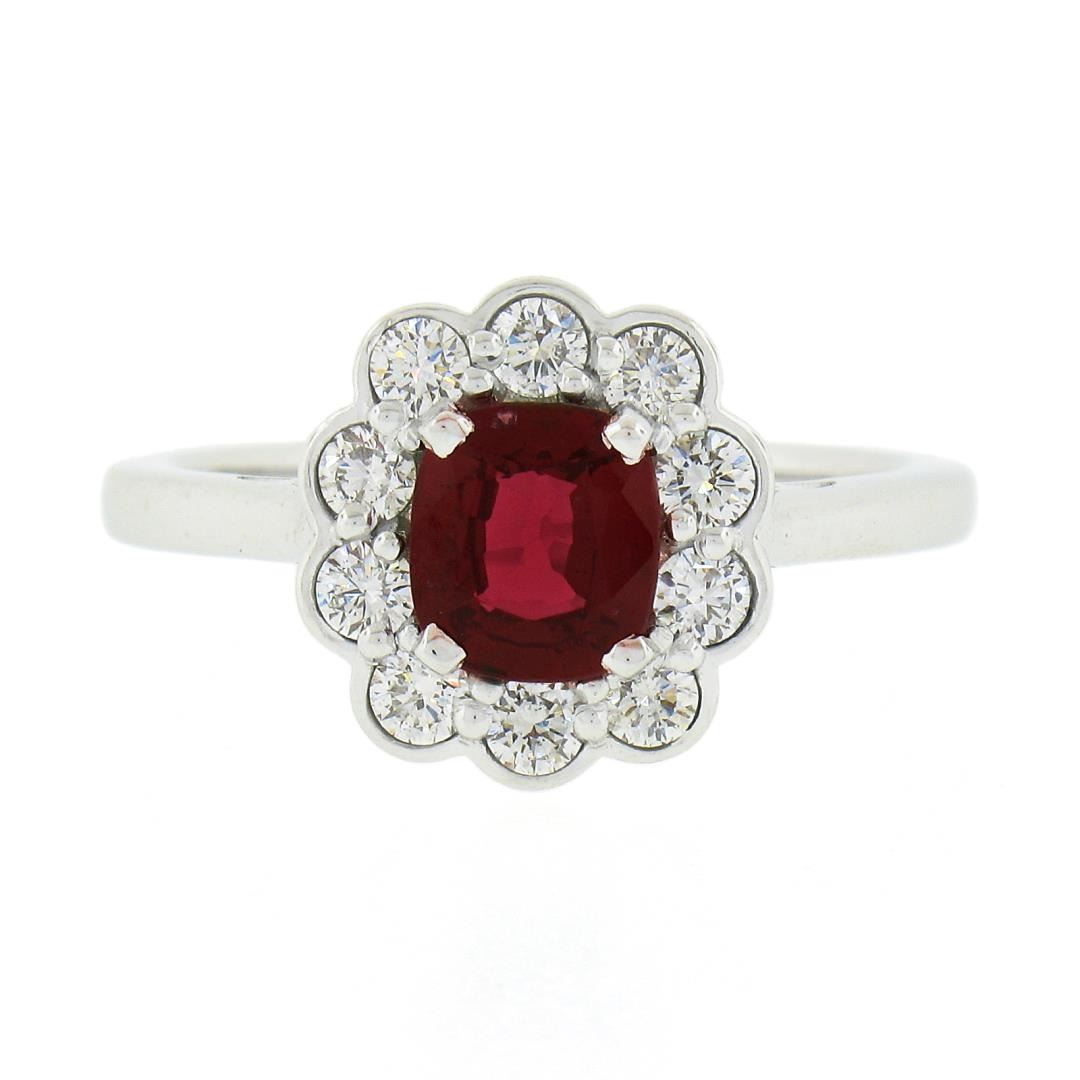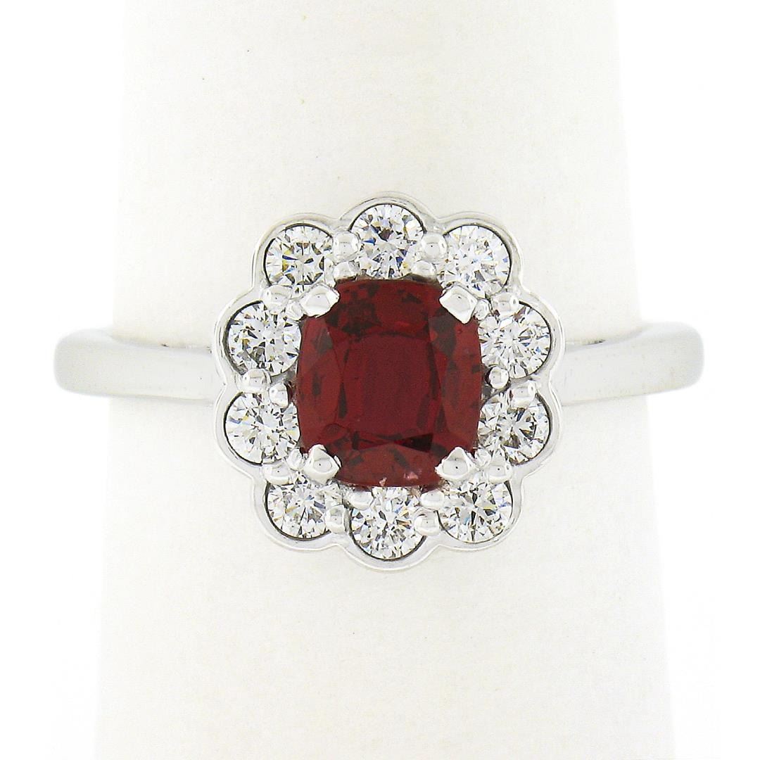A new solid platinum ring, with 1 GIA graded cushion cut natural spinel (0.92ct ), surrounded with a halo of 10 round cut natural diamonds (G/H - VS1/VS2 ; 0.43ctw). The ring is size 6.5, weighs a total of 5.43 grams, and measures 11.55mm wide. Comes with all original relevant certifications.