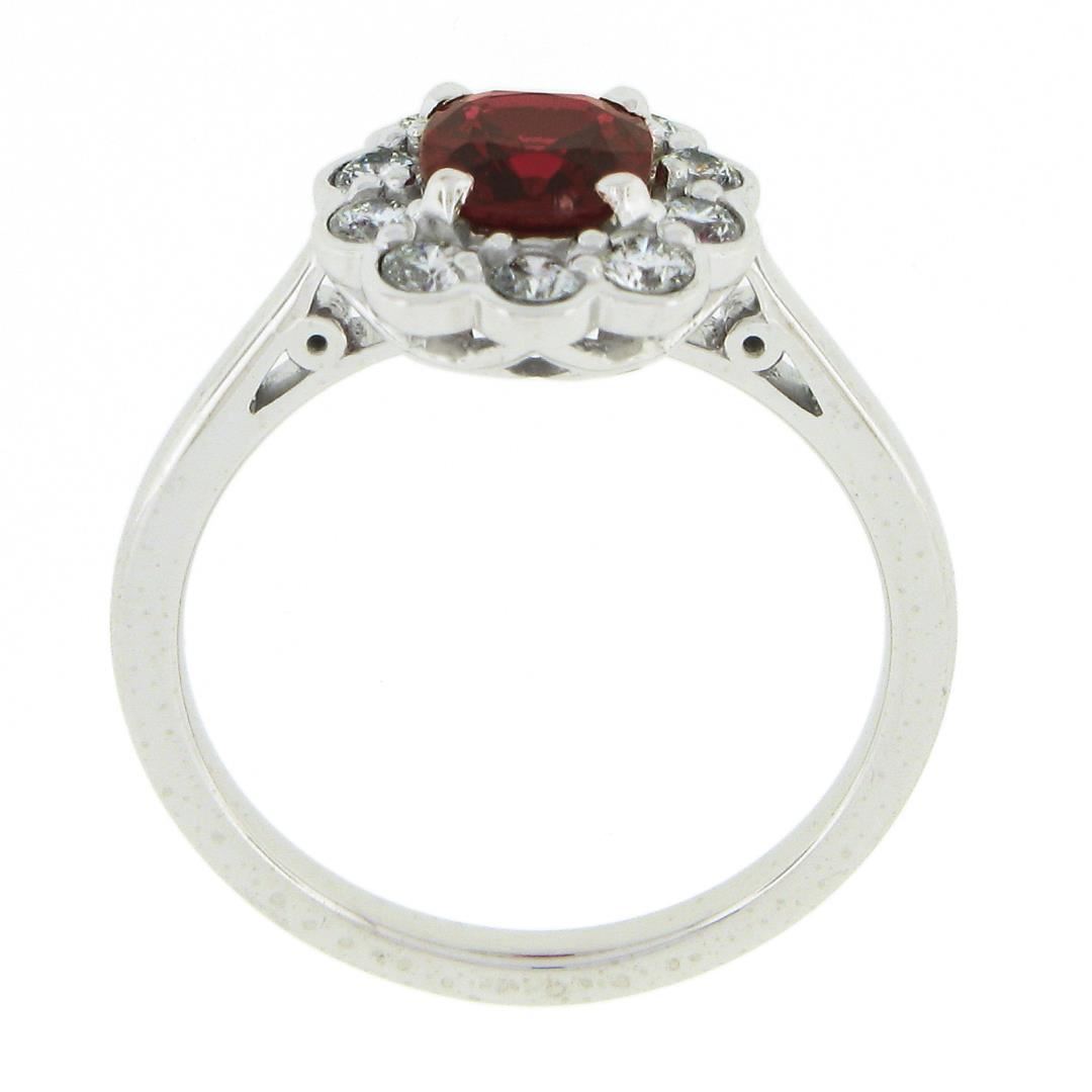 A new solid platinum ring, with 1 GIA graded cushion cut natural spinel (0.92ct ), surrounded with a halo of 10 round cut natural diamonds (G/H - VS1/VS2 ; 0.43ctw). The ring is size 6.5, weighs a total of 5.43 grams, and measures 11.55mm wide. Comes with all original relevant certifications.