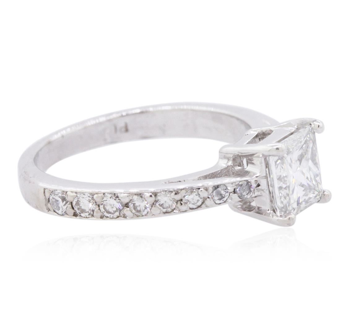 One electronically tested platinum ladies cast diamond unity ring with a bright polish finish. The featured diamond is supported by diamond set shoulders, completed by a two millimeter wide band. Identified with markings of "PLAT". Condition is good. Containing: One prong set princess cut diamond, measuring 5.50 x 5.30 x 3.75mm (depth est.), 6.00.%. GTCF approximate weight of 1.05ct. Graded in the setting. Clarity: I-1. Color: 70.8%. Table 80.2%. Sixteen prong set round brilliant cut diamonds, measuring 1.90 - 1.50 x 1.02mm (depth est.) approximate total weight of 16 Stones = 0.38ct. Graded in the setting. Clarity: VS-2 to SI-1. Color: H - J. Total Weight of Diamonds 1.43ct. Total Weight of Ring 5.43 grams. AIG Appraised at $13,610.00.