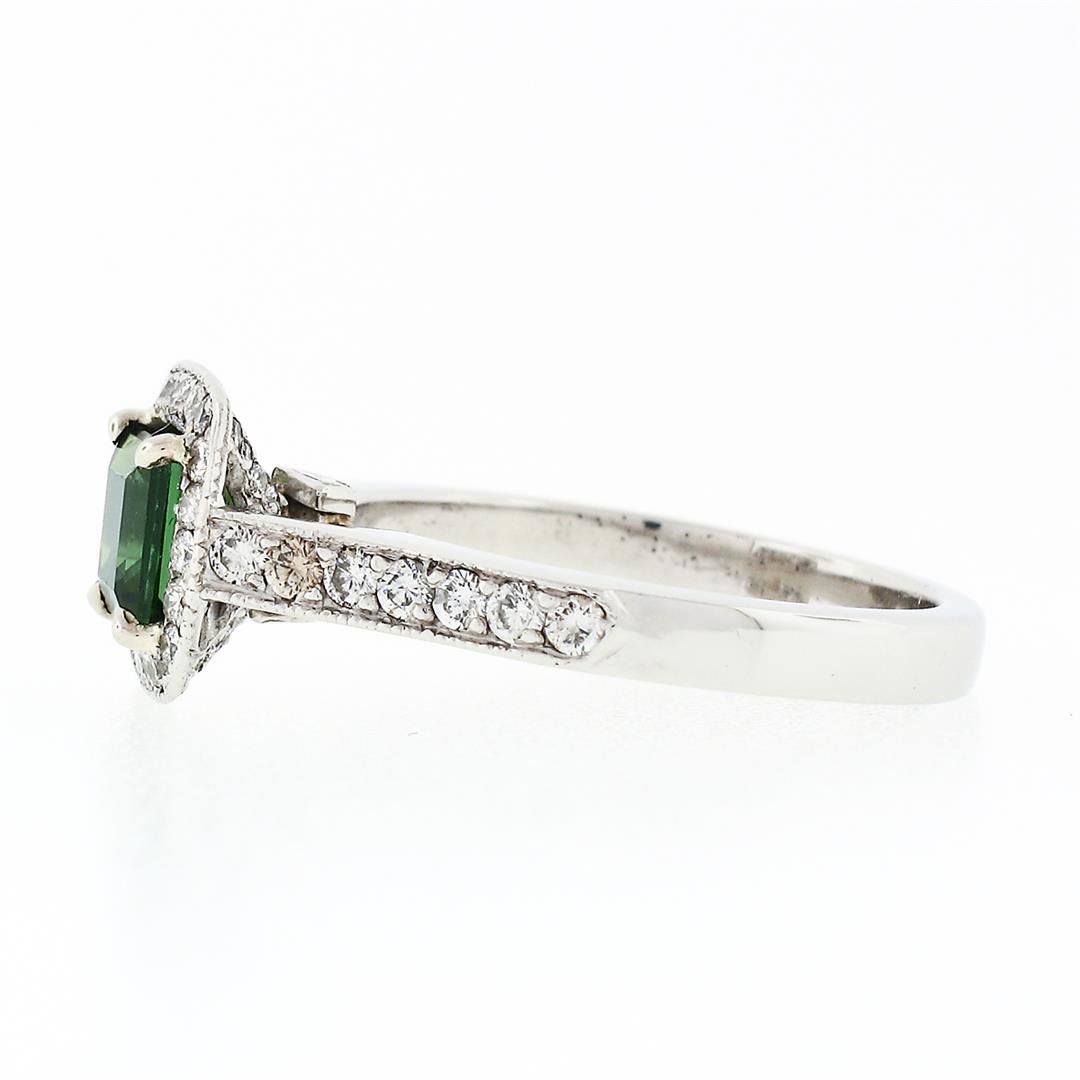 A solid platinum solitaire engagement ring, with 1 square step cut natural tourmaline (5.25mm; 0.85ct), surrounded with a halo of 50 round brilliant cut natural diamonds (G/H - VS1/VS2; 0.62ctw), and 2 square princess cut natural diamonds (G - VS1; 0.04ctw). The ring is size 6.0, weighs a total of 6.17 grams, and measures 9.15mm wide.