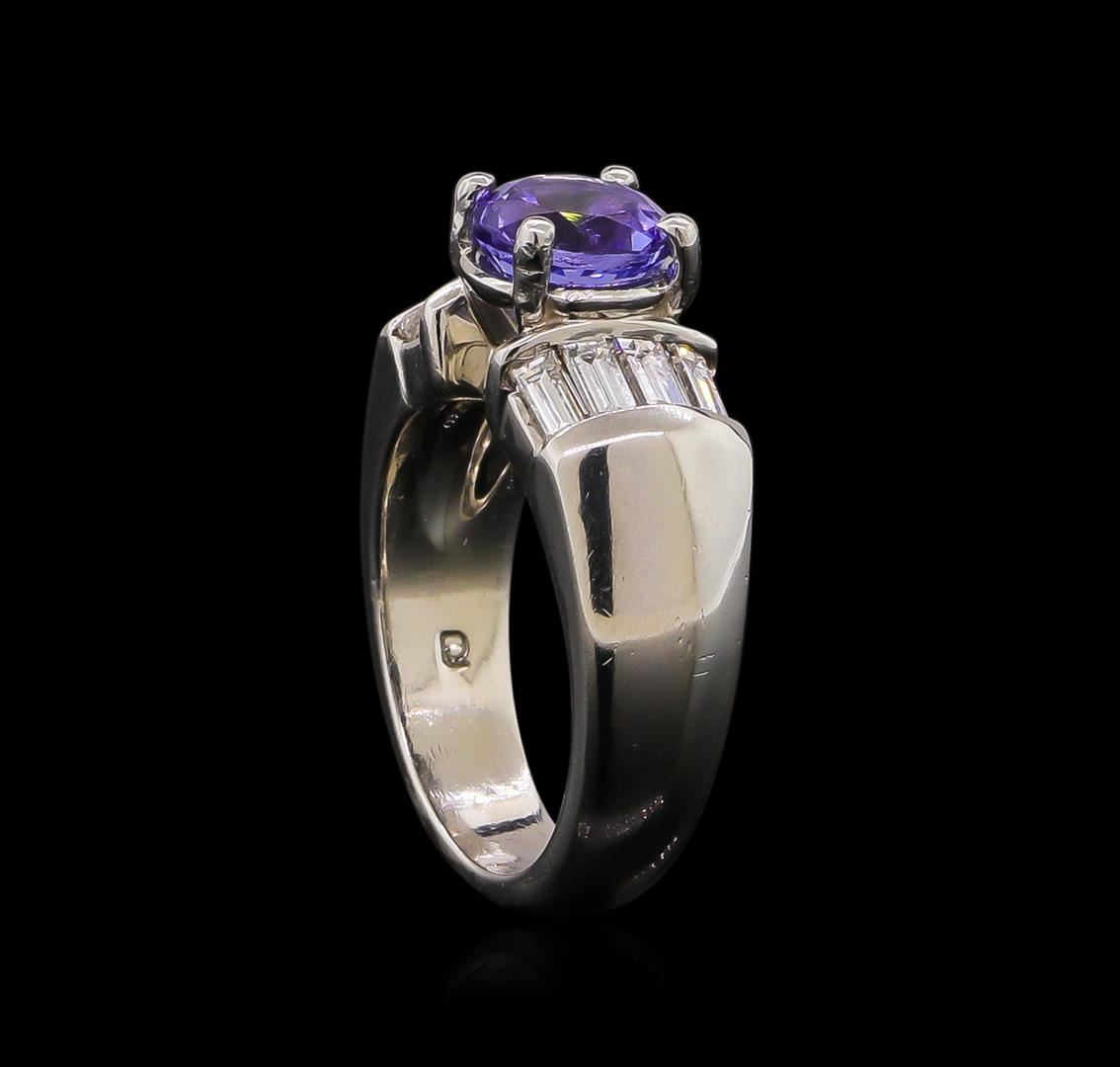 One electronically tested platinum ladies combination cast & assembled tanzanite and diamond ring with a bright polish finish. Identified with markings of "PLAT". Condition is new. Containing: One prong set round modified brilliant cut natural tanzanite, measuring 7.20 - 7.20 x 4.68 mm, approximate weight of 1.63ct., clarity is eye clean, type I, light, very slightly grayish, violet color, (GIA V 3/3), cut is very good. Eight channel set baguette cut diamonds, measuring 3.50 x 1.80 x 1.53mm (depth est.) approximate total weight of 8 Stones = 0.71ct. Clarity: VS-2. Color: G - H, Cut is Good. Colored gemstones are presumed to have been subjected to commonly used enhancement processes. All diamonds and colored gemstones are graded in the mounting, unless otherwise stated. Total Weight of Colored Stones 1.63ct. Total Weight of Diamonds 0.71ct. Total Weight of Ring 16.60 grams. GGL Appraised at $7,920.00.