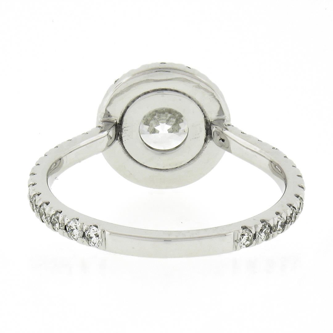 A new solid platinum engagement ring, with 1 GIA graded round cut natural diamond (E - IF ;1.04), surrounded with 42 round cut natural diamonds (E/F - VS1/VS2 ; 0.61ctw ). The ring is size 6.5, weighs a total of 3.83 grams, and measures 10.1mm wide. Comes with all original relevant certifications.