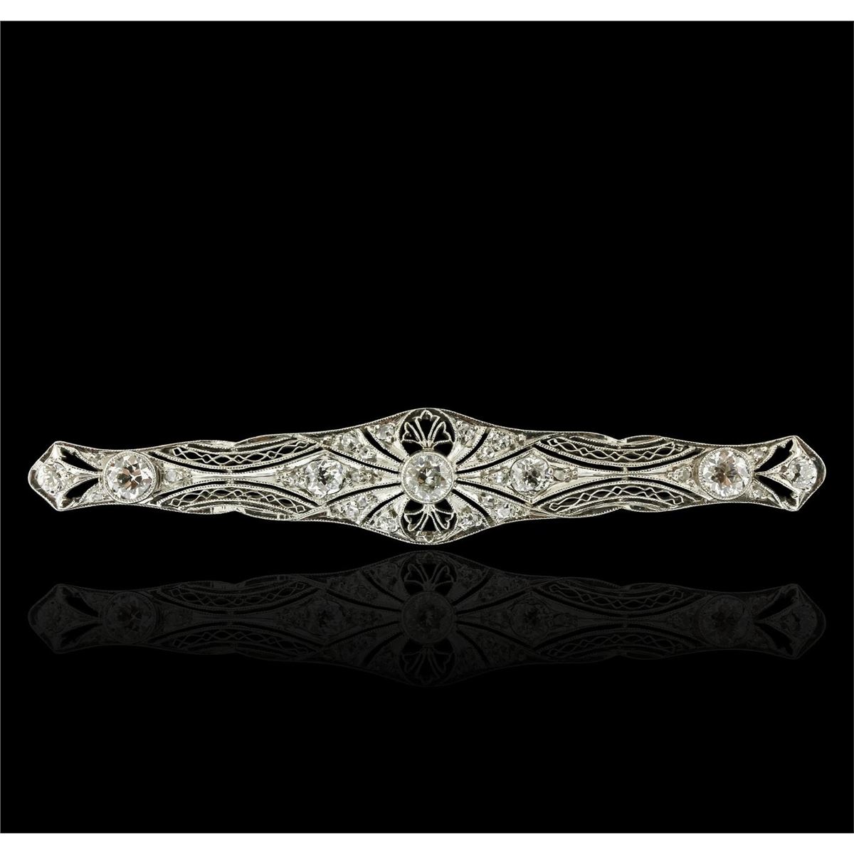 One electronically tested platinum ladies cast & assembled diamond brooch. The brooch is completed by a horizontally placed pin. Bright polish finish with milgrain detailing throughout. Area measurements 2.75 x 0.55 inches. The brooch is reminiscent of the jewelry designs from the Art Deco Period. The Paris Exposition of Decorative Arts and Modern Manufacturers in 1925 gave the movement its name. The Art Deco Period is characterized with jewelry designs composed of bold geometric designs, & cubism. Condition is good. Containing: Three bezel set Old European cut diamonds, measuring 4.30 - 4.20 x 2.20mm (depth est.) approximate total weight of 3 Stones = 0.82ct. Cutting style circa late 19th century. Graded in the setting. Clarity: SI-1 to SI-2. Color: H - I Four bead set Old European cut diamonds, measuring 3.50 - 3.10 x 2.20mm (depth est.) approximate total weight of 4 Stones = 0.68ct. Cutting style circa early and late 19th century. Graded in the setting. Clarity: SI-1 to SI-2. Color: H - I Twenty-Two bead set rose cut diamonds, measuring 1.70 - 1.30 x 0.70mm (depth est.) approximate total weight of 22 Stones = 0.20ct. Graded in the setting. Clarity: SI-1 to I-1. Color: H - I. Total Weight of Diamonds 1.70ct. Total Weight of Brooch 8.46 grams. AIG Appraised at $7,290.00.