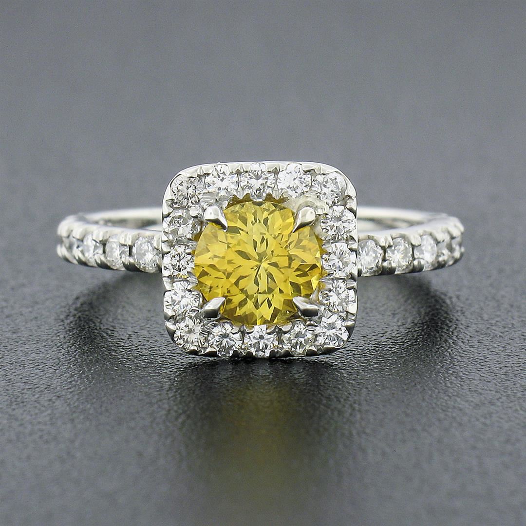 A solid platinum engagemet ring, with 1 Gia certified round brilliant cut natural yellow sapphire (0.99ct ), accented with 38 round brilliant cut natural diamonds ( F/G - VS1/VS2 ; 0.75ctw). The ring is size 7.0, weighs a total of 5.59 grams, and measure