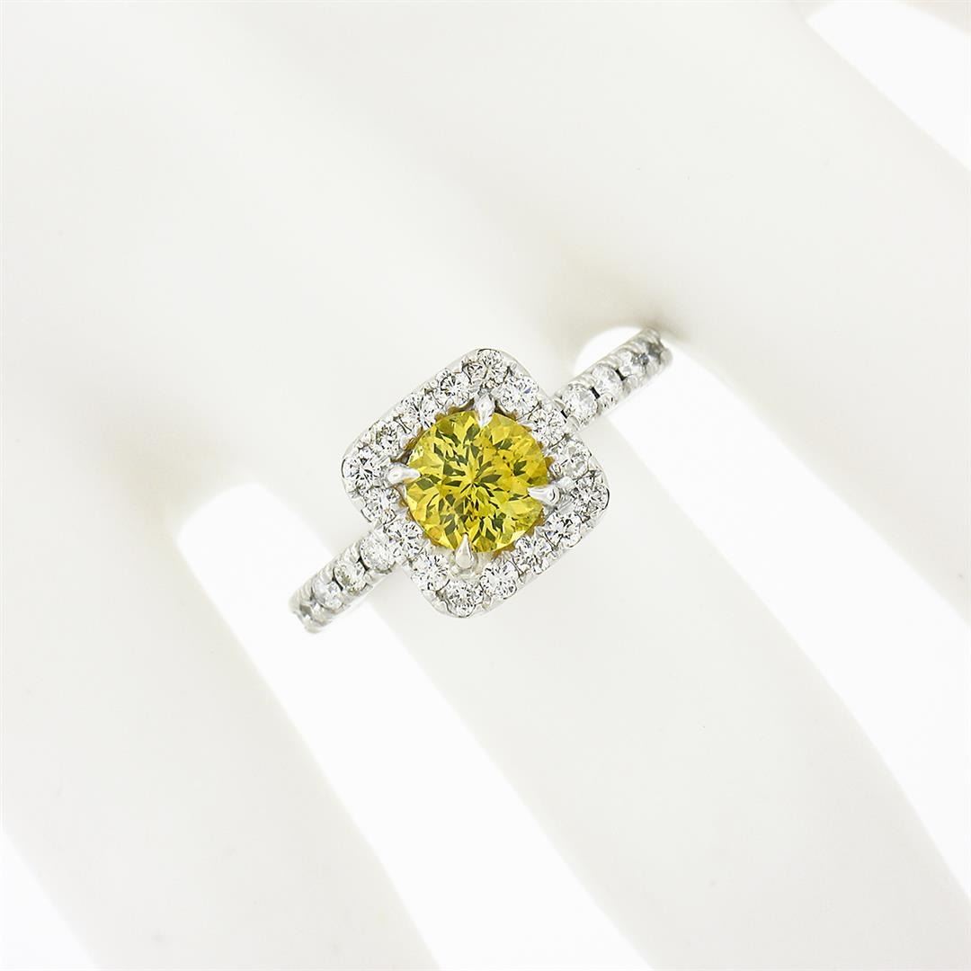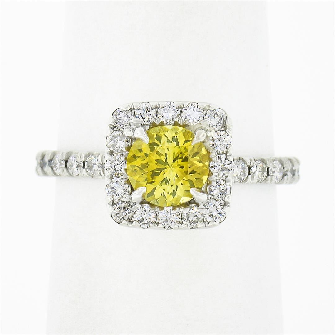 A solid platinum engagemet ring, with 1 Gia certified round brilliant cut natural yellow sapphire (0.99ct ), accented with 38 round brilliant cut natural diamonds ( F/G - VS1/VS2 ; 0.75ctw). The ring is size 7.0, weighs a total of 5.59 grams, and measure