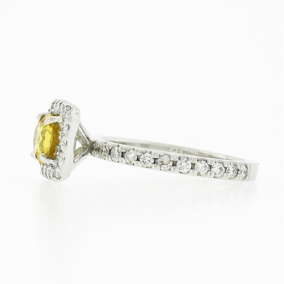 A solid platinum engagemet ring, with 1 Gia certified round brilliant cut natural yellow sapphire (0.99ct ), accented with 38 round brilliant cut natural diamonds ( F/G - VS1/VS2 ; 0.75ctw). The ring is size 7.0, weighs a total of 5.59 grams, and measure