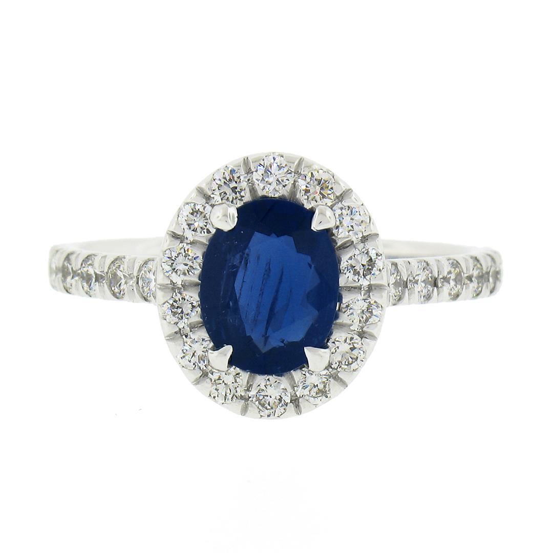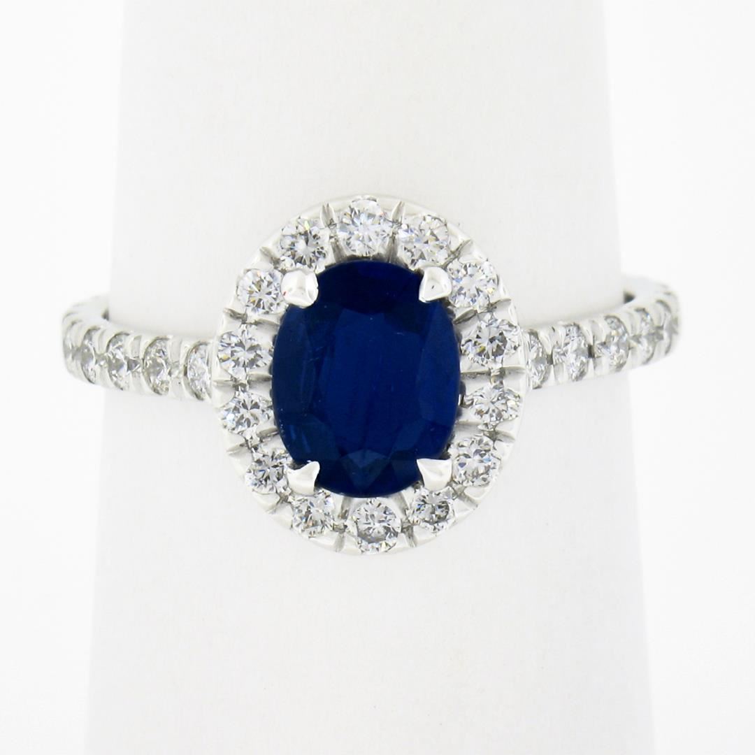 A new solid platinum ring, with 1 GIA graded oval cut natural sapphire (1.10ct), and 38 round cut natrual diamonds (F/G - VS1/VS2 ; 0.80ctw). The ring is size 7.5, weighs a total of 3.65 grams, and measures 11.4mm wide. Comes with all original relevant certifications.