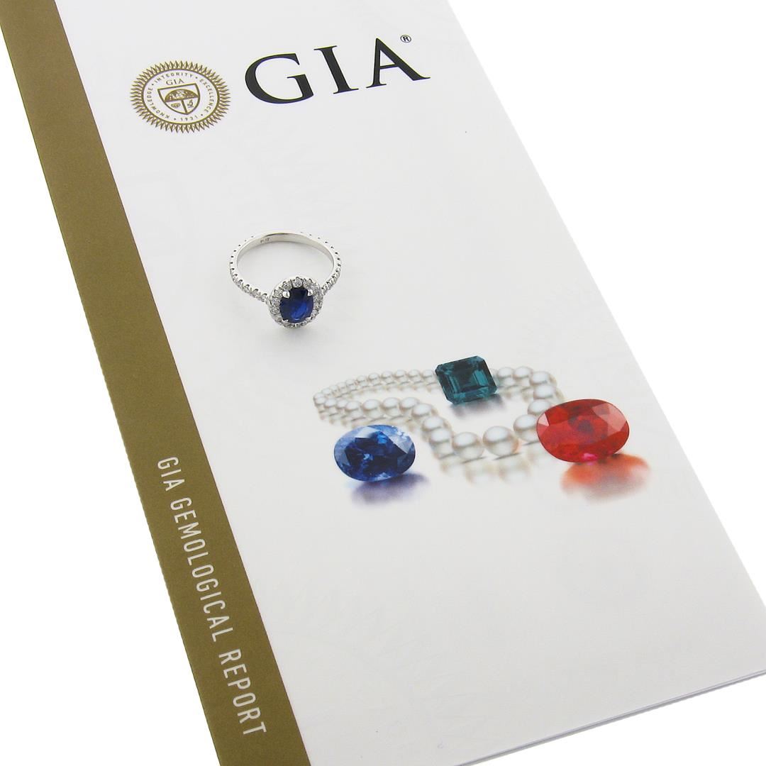 A new solid platinum ring, with 1 GIA graded oval cut natural sapphire (1.10ct), and 38 round cut natrual diamonds (F/G - VS1/VS2 ; 0.80ctw). The ring is size 7.5, weighs a total of 3.65 grams, and measures 11.4mm wide. Comes with all original relevant certifications.