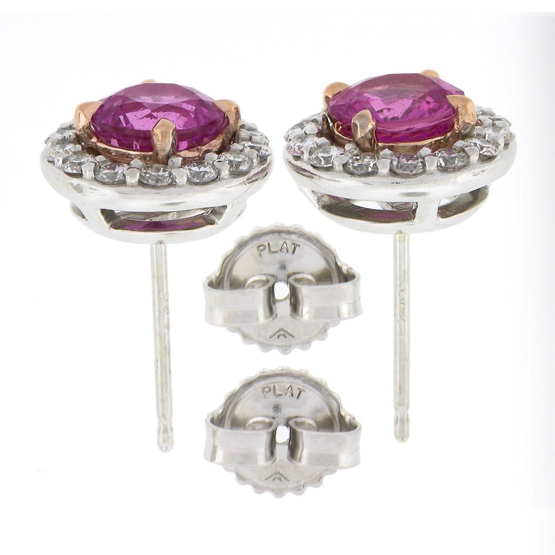 A new solid platinum & 14k rose gold stud earrings, with 2 GIA graded round cut pink sapphire (2.47ctw ), surrounded with a halo of round cut natural diamonds (G/H - VS1/VS2 ; 0.59ctw). The earrings measure approximately 10.5mm in diameter and weigh a total of 6.44 grams. Comes with all original relevant certifications.