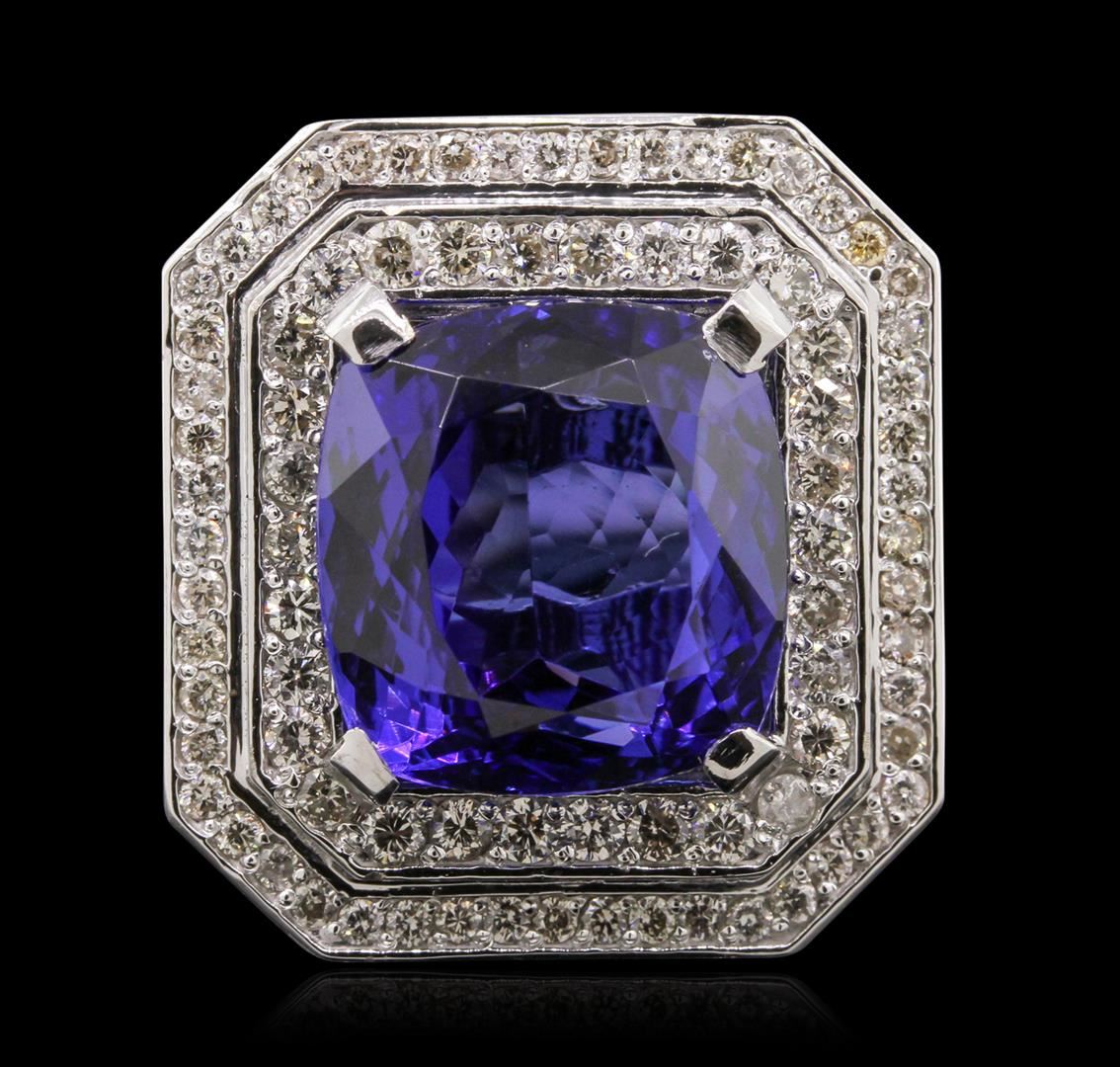 One electronically tested platinum lady's combination cast and assembled ring with a bright polish finish. Condition is new. Containing: One prong set square cushion modified brilliant cut natural tanzanite, measuring 14.73 x 14.24 x 9.60mm, approximate weight of 15.86ct., clarity is eye clean, type I, medium, moderately strong, violetish blue color, (GIA vB 5/4), cut is very good. Colored gemstones are presumed to have been subjected to commonly used color/clarity enhancement processes. One Hundred Two prong set round brilliant cut diamonds, measuring 2.00 - 1.50 x 1.05mm (depth est.) approximate. Total Weight of 102 Stones = 2.07ct. Clarity: I-1 to I-2. Color: I - J, Cut is Very Good. Total Weight of Colored Stones 15.86ct. Total Weight of Diamonds 2.07ct. Total Weight of Ring 21.30 grams. GGL Appraised at $37,580.00.
