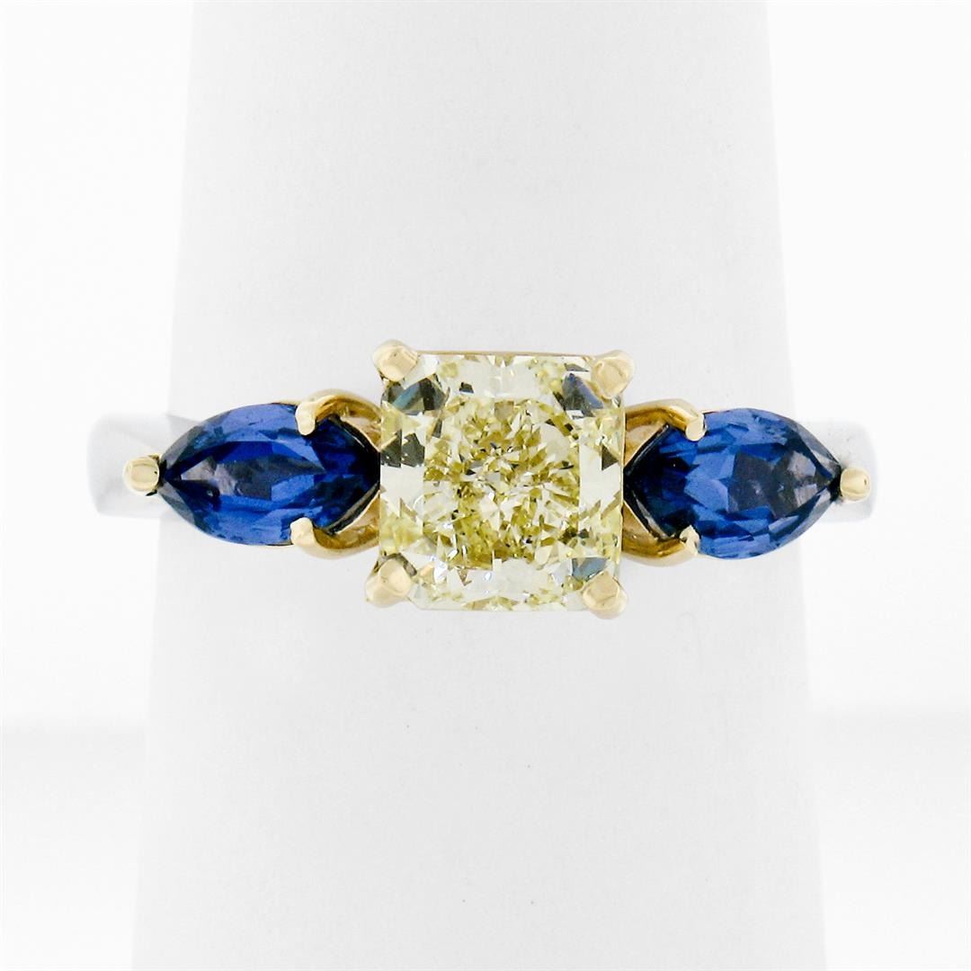A new solid platinum and 18k yellow gold 3 stones ring, featuring 1 Gia certified Radiant Cut natural yellow diamond (VVS1; 1.46ct), and 2 marquise cut natural sapphires (1.15ctw). The ring is size 7.0, weighs a total of 6.40 grams, and measures 19.5mm wide. Comes with all original relevant certifications.
