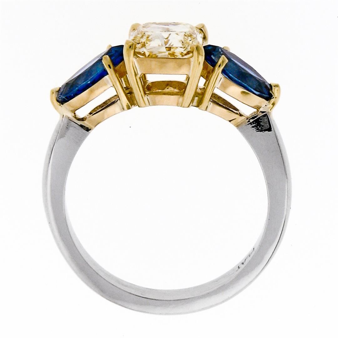 A new solid platinum and 18k yellow gold 3 stones ring, featuring 1 Gia certified Radiant Cut natural yellow diamond (VVS1; 1.46ct), and 2 marquise cut natural sapphires (1.15ctw). The ring is size 7.0, weighs a total of 6.40 grams, and measures 19.5mm wide. Comes with all original relevant certifications.