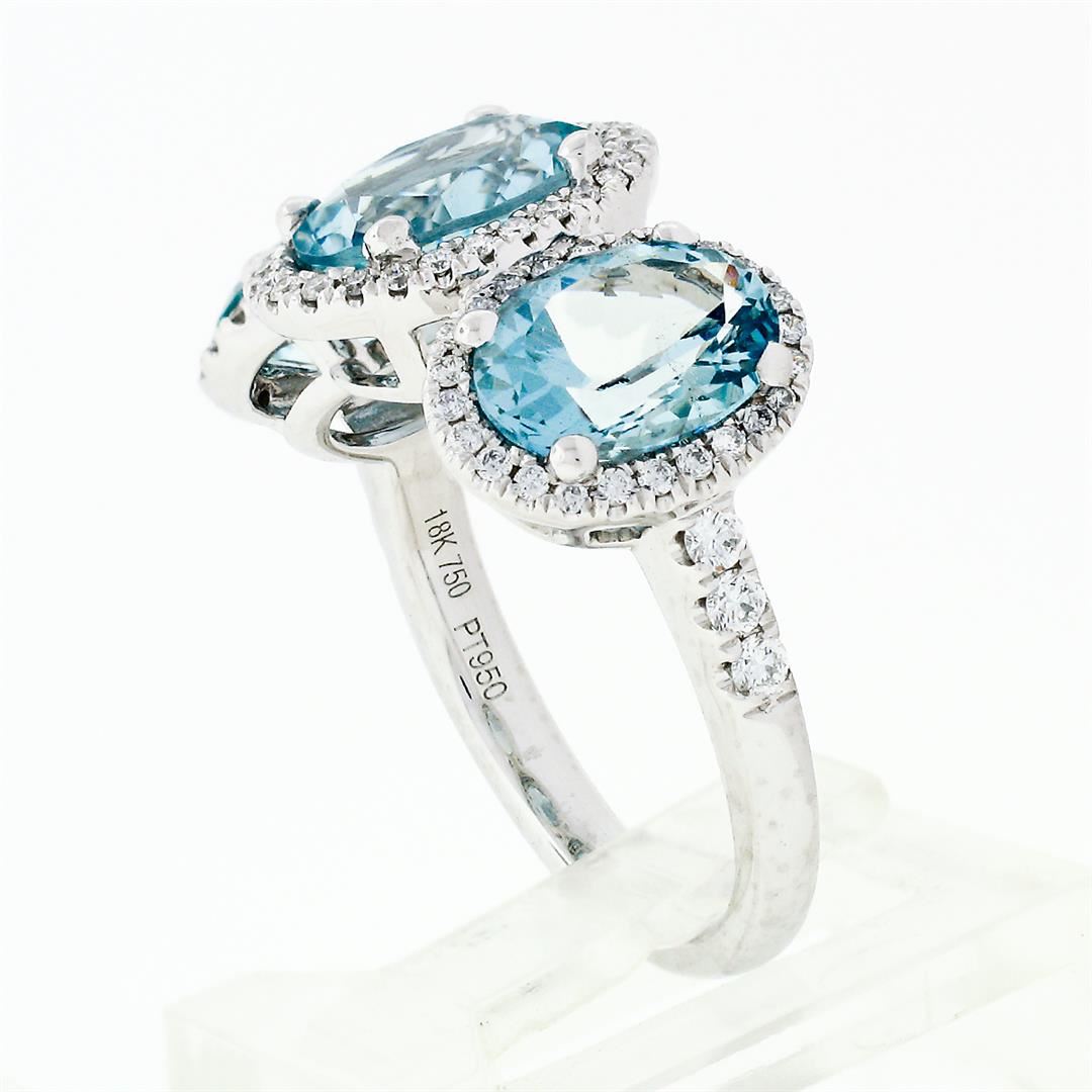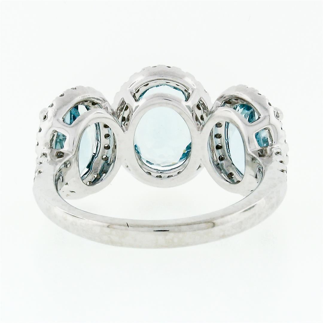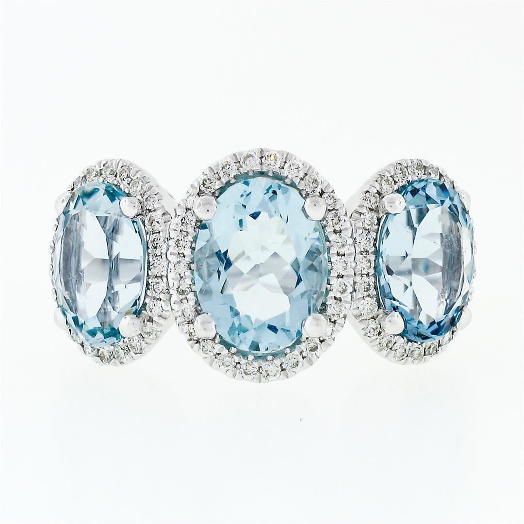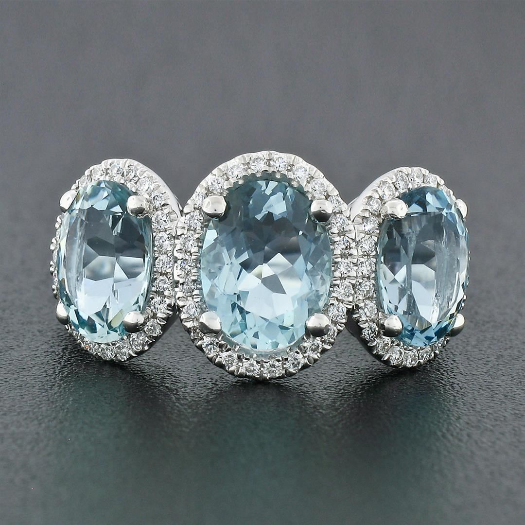 A solid platinum and 18k white gold band ring with 3 oval cut natural aquamarines (3.28ctw) and a halo of 74 round brilliant cut natural diamonds (G/H - VS1/VS2; 0.80ctw). The ring is size 6.0, weighs a total of 7.60 grams, and measures 11.46mm wide.