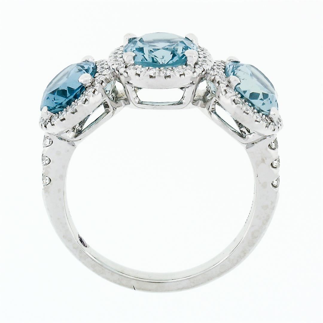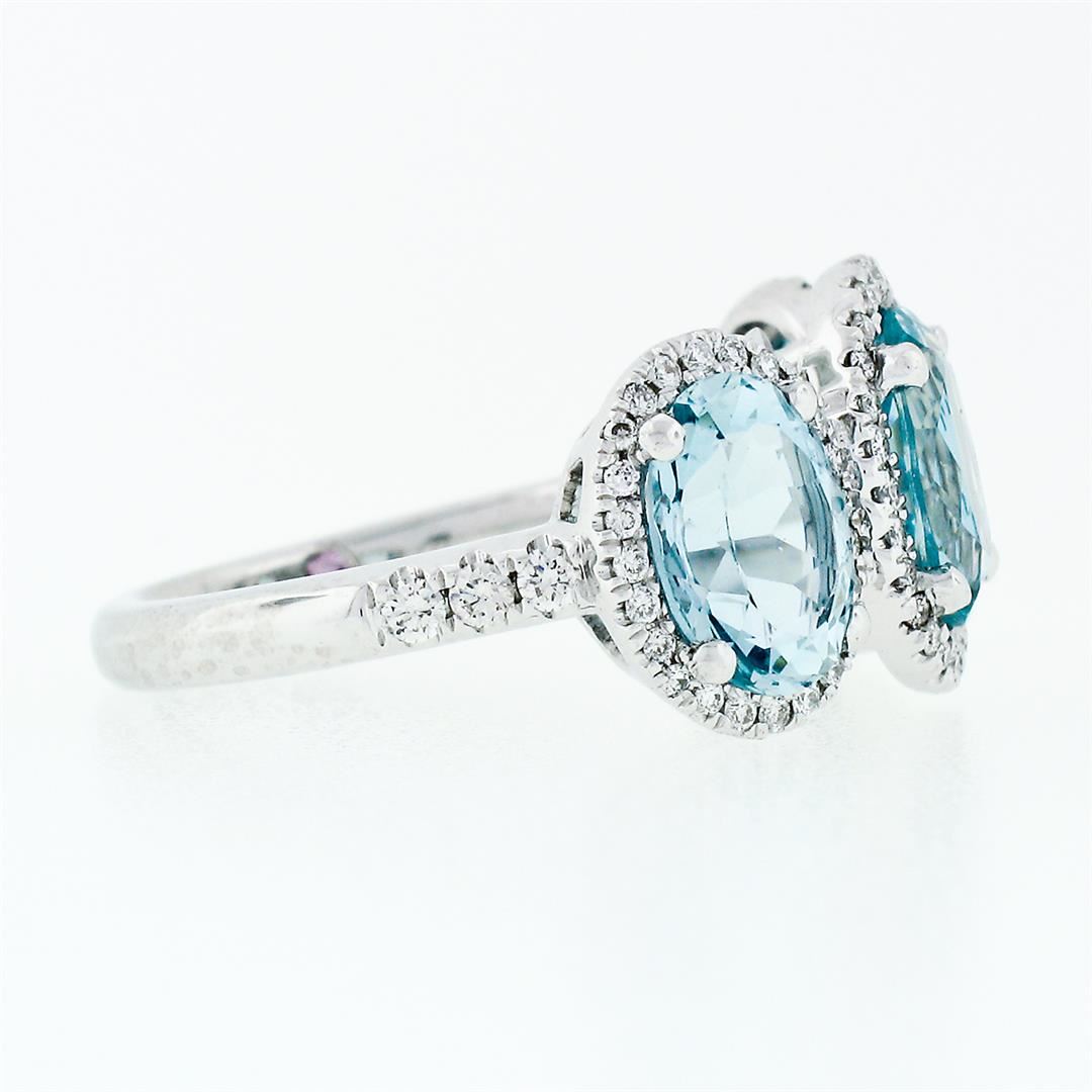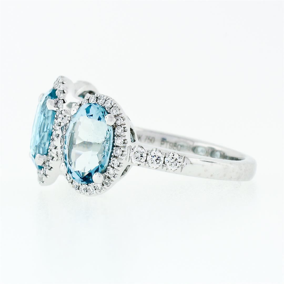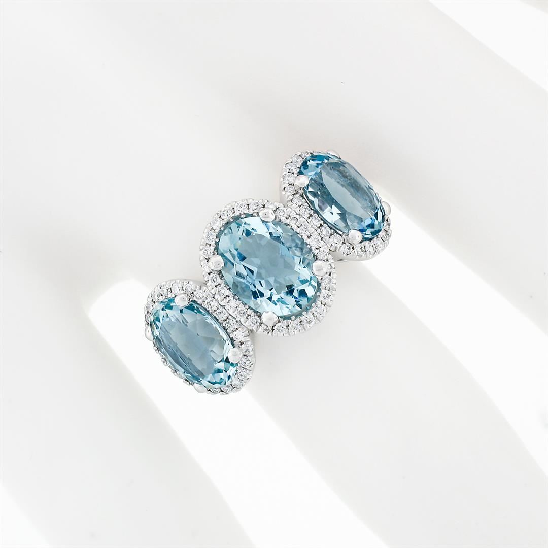 A solid platinum and 18k white gold band ring with 3 oval cut natural aquamarines (3.28ctw) and a halo of 74 round brilliant cut natural diamonds (G/H - VS1/VS2; 0.80ctw). The ring is size 6.0, weighs a total of 7.60 grams, and measures 11.46mm wide.