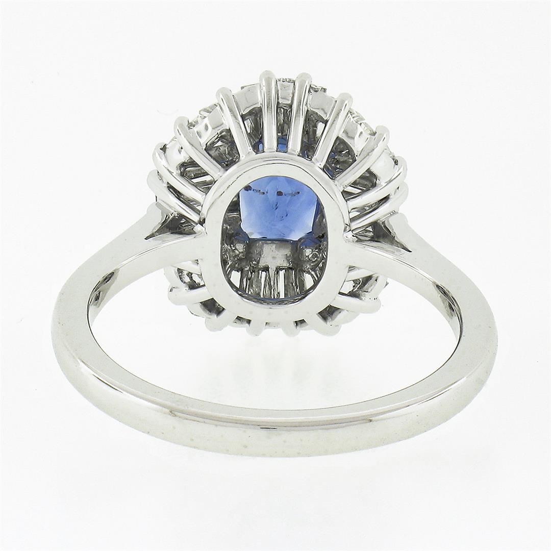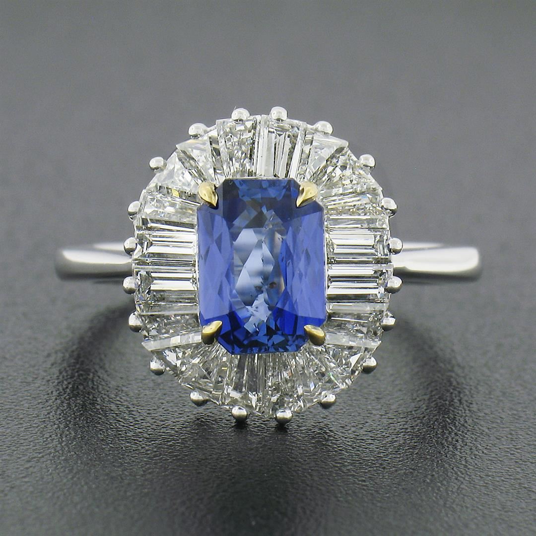 A solid platinum & 18k yellow gold balerrina ring, with 1 Gia certified octagonal cut natural burma sapphire (2.09ct ), and 20 baguette cut natural diamonds (E/F - VVS1/VVS2 ; 1.80ctw). The ring is size 7.0, weighs a total of 7.43 grams, and measures 14.8
