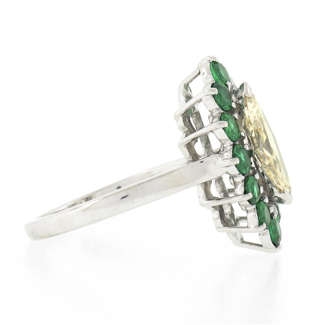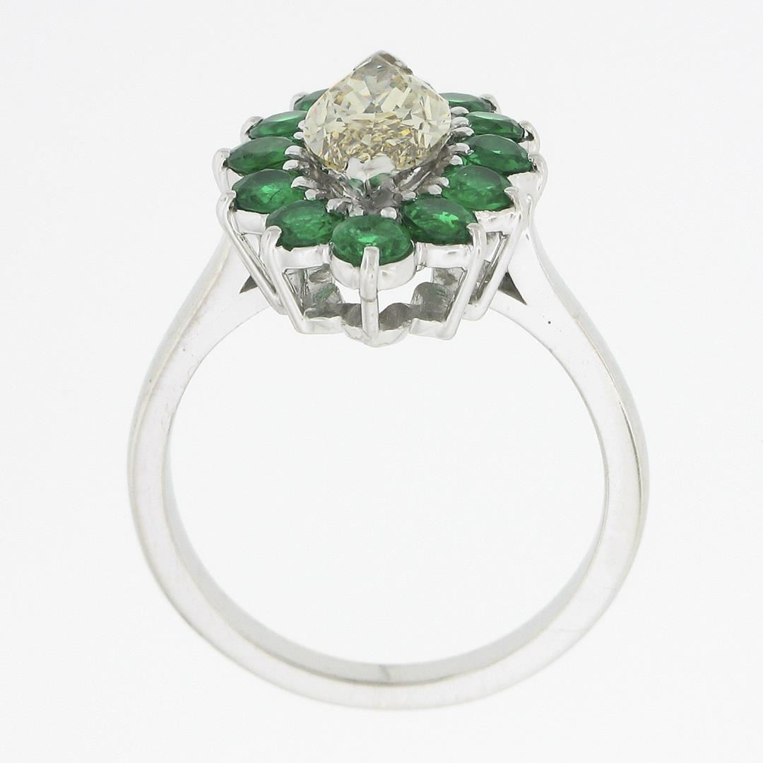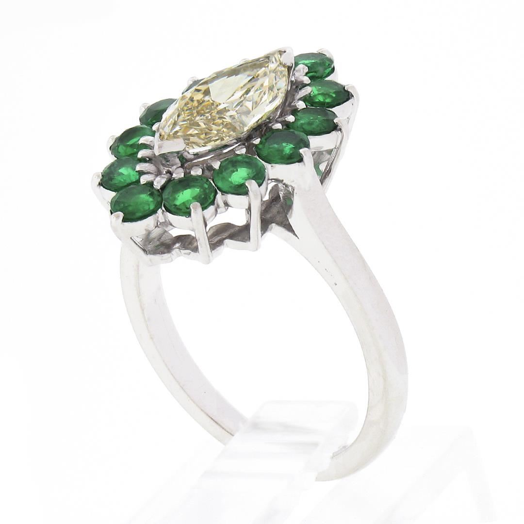 A solid platinum ring, with 1 marquise cut natural light yellow diamond (S/T - VS1 ; 1.10ct), and a halo of 12 round brilliant cut natural emeralds (1.20ctw ). The ring is size 5.5, weighs a total of 6.75 grams, and measures 18.9mm wide.