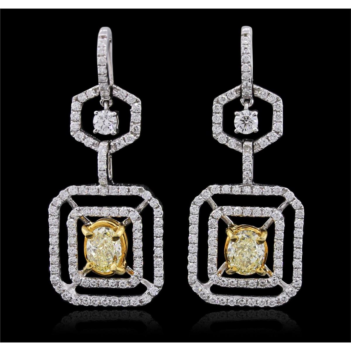 One pair electronically tested platinum ladies cast & assembled diamond dangle style earrings with standard backs. Condition is good. Each earring features a diamond mounted in a yellow gold accented basket, set within a two tiered diamond bezel, supported by a diamond wreath, completed by a diamond set bar link. Bright polish finish. Containing: Two prong set oval shaped cut diamonds, measuring 5.90 x 4.80 x 3.02mm (depth est.), 8.00.%. GTCF approximate. Total Weight of 2 Stones = 1.21ct. Measurements are an average for the pair. Graded in the setting. Clarity: VS-2 to SI-1 Two prong set round brilliant cut diamonds, measuring 3.10 - 3.00 x 1.83mm (depth est.) approximate. Total Weight of 2 Stones = 0.24ct. Graded in the setting. Clarity: SI-1 to SI-2. Color: F - G One Hundred Eighty prong set round brilliant cut diamonds, measuring 1.30 - 1.00 x 0.69mm (depth est.) approximate. Total Weight of 180 Stones = 1.09ct. Graded in the setting. Clarity: VS-1 to SI-1. Color: F - H. Total Weight of Diamonds 2.54ct. Total Weight of Earrings Dangle 9.80 grams. AIG Appraised at $20,635.00.