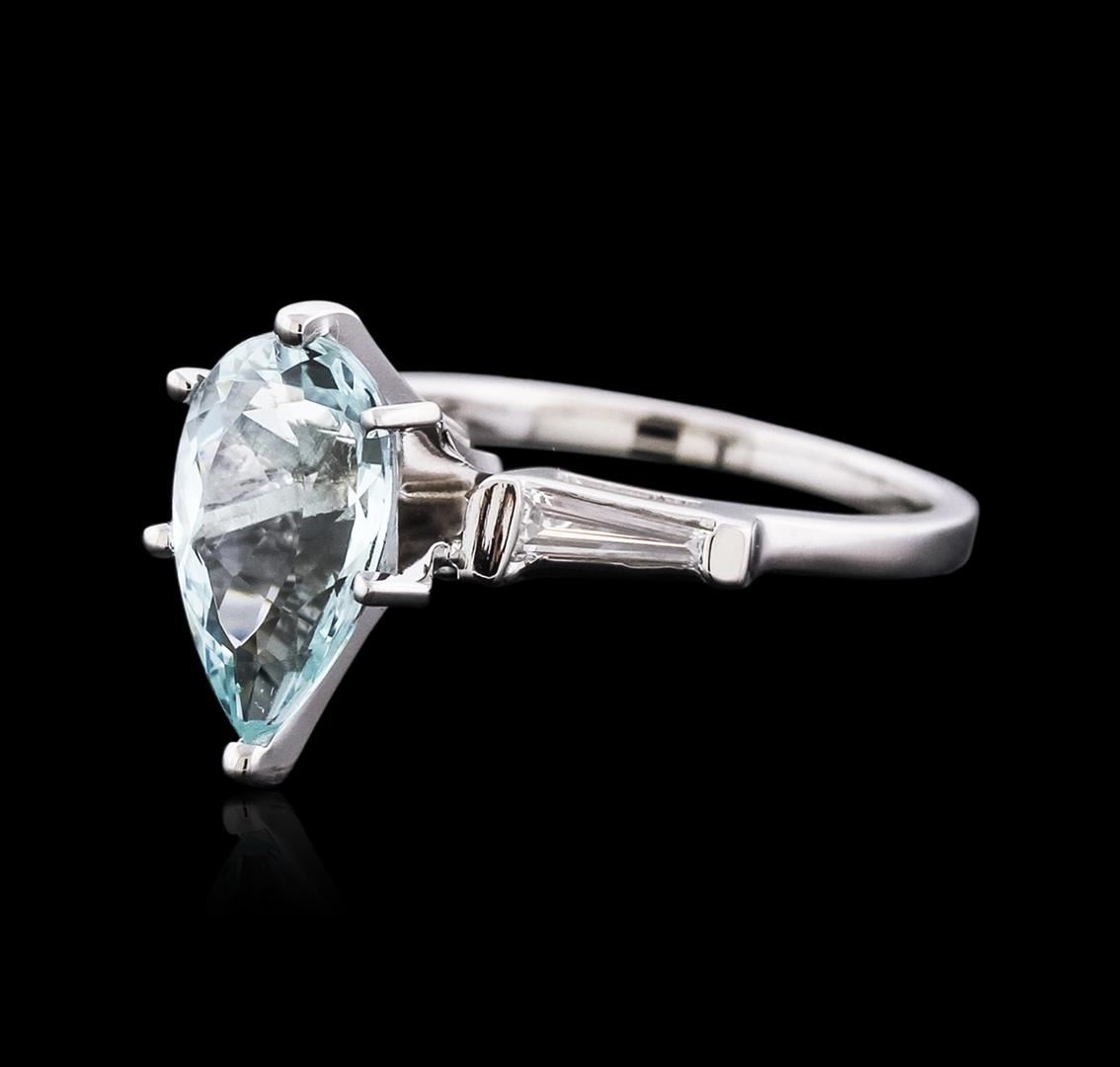 One ring featuring: platinum weighing 6.60 grams containing one aquamarine center stone with a total weight of 2.59ct and two baguette cut diamonds with a total weight of 0.40ct.