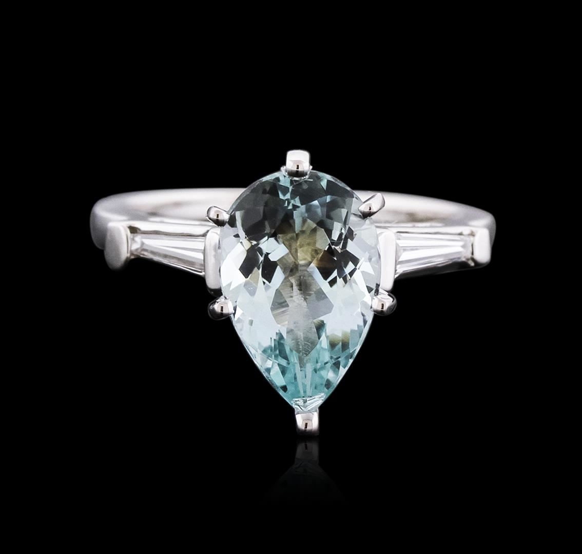 One ring featuring: platinum weighing 6.60 grams containing one aquamarine center stone with a total weight of 2.59ct and two baguette cut diamonds with a total weight of 0.40ct.