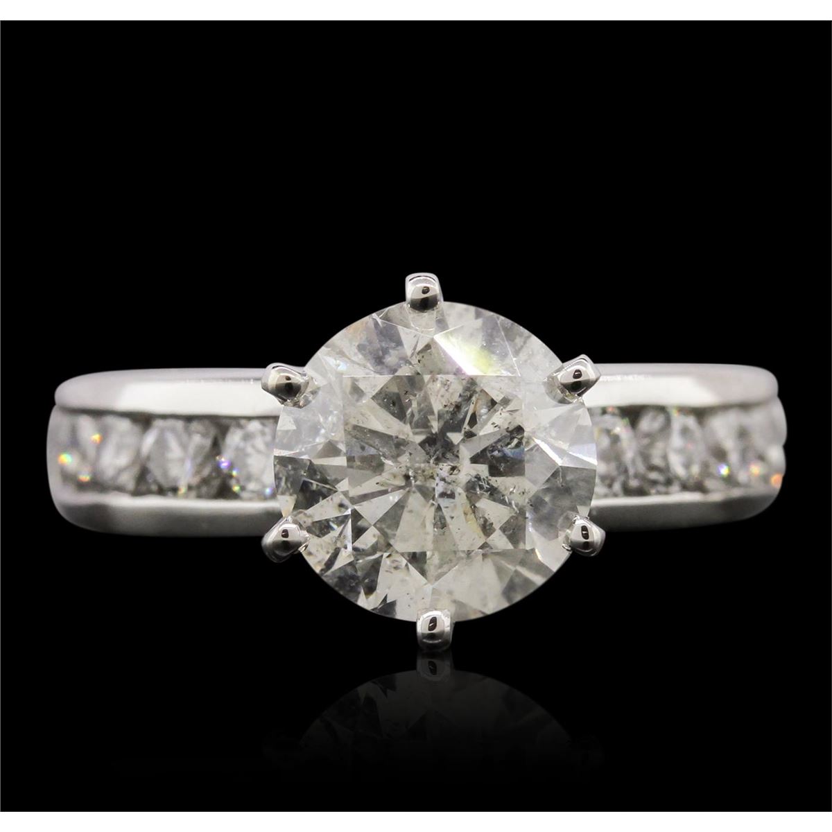 One electronically tested platinum Ladies combination cast & assembled engagement ring with a bright polish finish. Condition is new. Identified with markings of "PT 950". Containing: One prong set round brilliant cut diamond, measuring 8.10 - 8.10 x 5.22mm (depth est.) approximate weight of 2.09ct. Clarity: I-2. Color: H, Cut is Good. Ten channel set round brilliant cut diamonds, measuring 2.80 - 2.80 x 1.68mm (depth est.) approximate. Total Weight of 10 Stones = 0.80ct. Clarity: SI-1 to SI-2. Color: H - I, Cut is Good. Total Weight of Diamonds 2.89ct. Total Weight of Engagement Ring 9.10 grams. GGL Appraised at $30,550.00.
