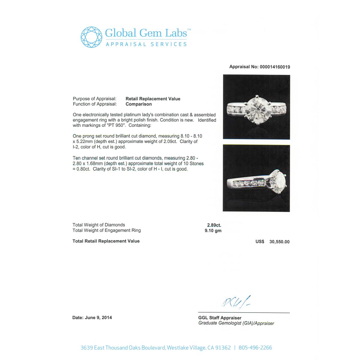 One electronically tested platinum Ladies combination cast & assembled engagement ring with a bright polish finish. Condition is new. Identified with markings of "PT 950". Containing: One prong set round brilliant cut diamond, measuring 8.10 - 8.10 x 5.22mm (depth est.) approximate weight of 2.09ct. Clarity: I-2. Color: H, Cut is Good. Ten channel set round brilliant cut diamonds, measuring 2.80 - 2.80 x 1.68mm (depth est.) approximate. Total Weight of 10 Stones = 0.80ct. Clarity: SI-1 to SI-2. Color: H - I, Cut is Good. Total Weight of Diamonds 2.89ct. Total Weight of Engagement Ring 9.10 grams. GGL Appraised at $30,550.00.