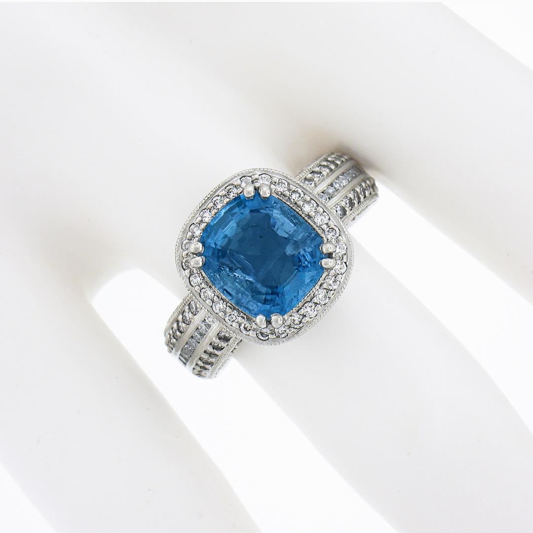 A solid platinum ring, with 1 cushion cut natural aquamarine (2.58ct ), and a halo of 94 round brilliant cut natural diamonds (G/H - VS2 ; 1.0ctw). The ring is size 7.0, weighs a total of 12.25 grams, and measures 12.95mm wide.