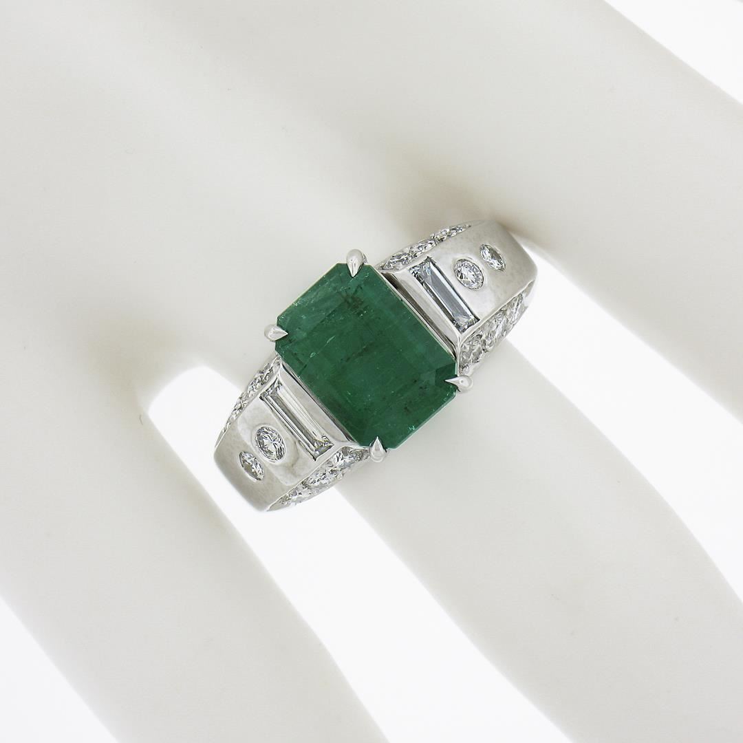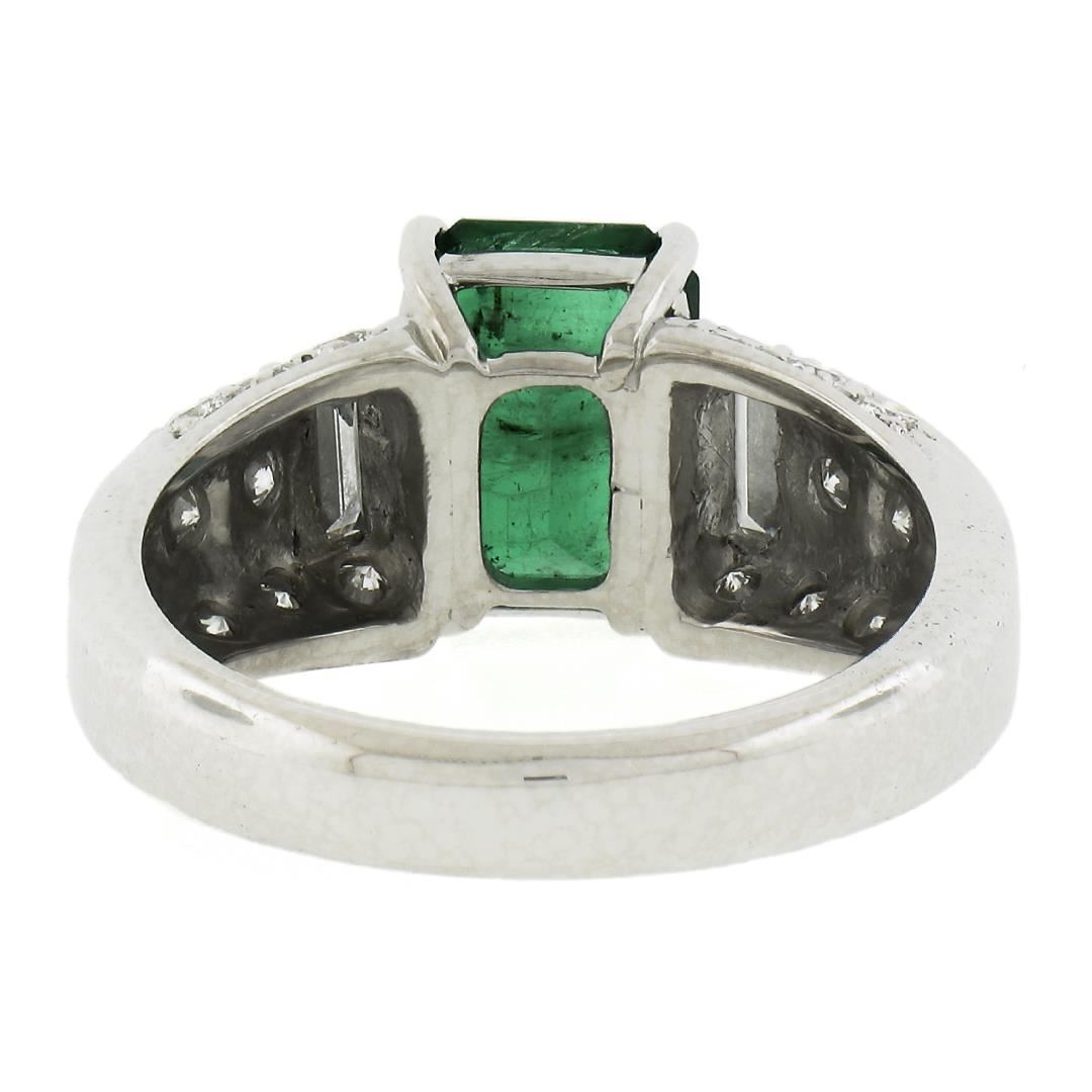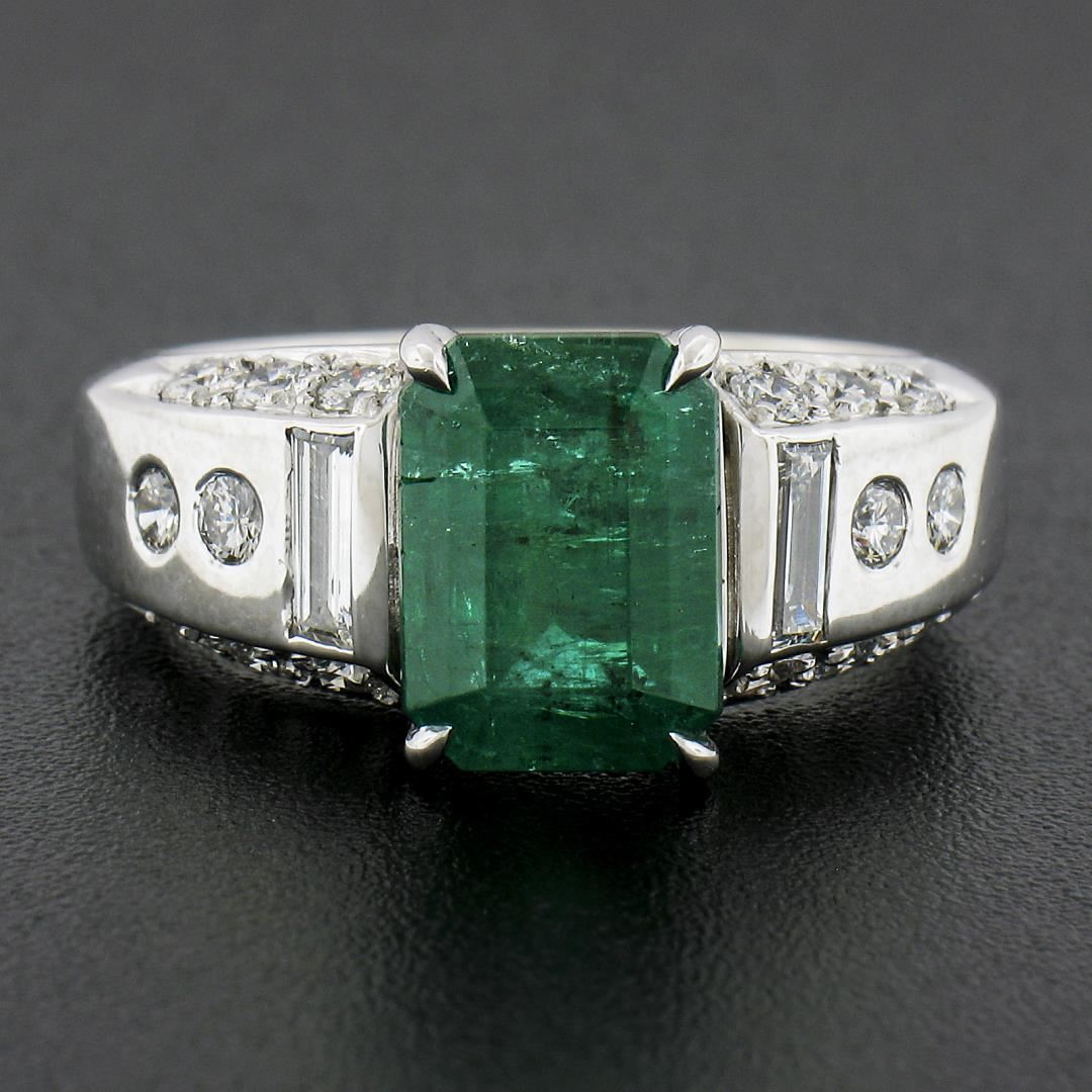 A platinum ring, with 1 GIA graded octagonal cut natural emerald ( 2.87ct ), and 18 baguette & round cut natural diamonds (G/H - VS1/VS2 ; 0.80ctw). The ring is size 8.5, weighs a total of 10.54 grams, and measures 10.5mm wide. Comes with all original relevant certifications.